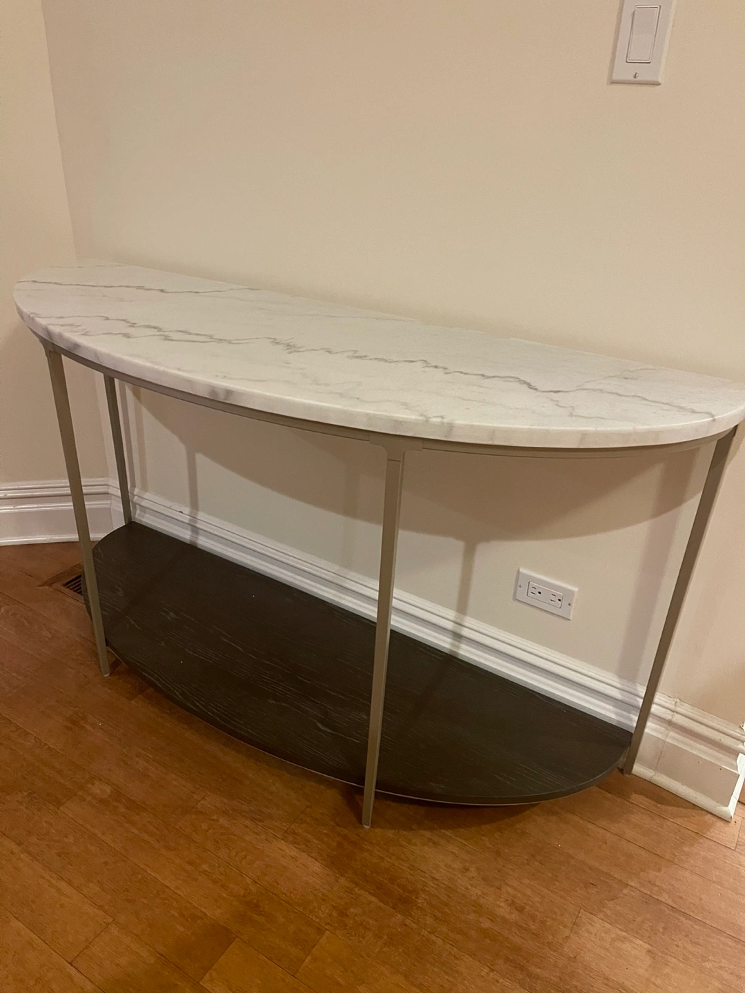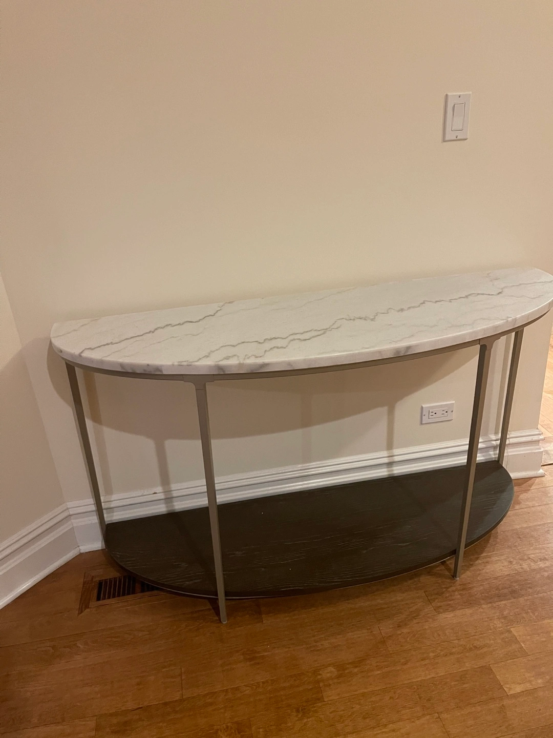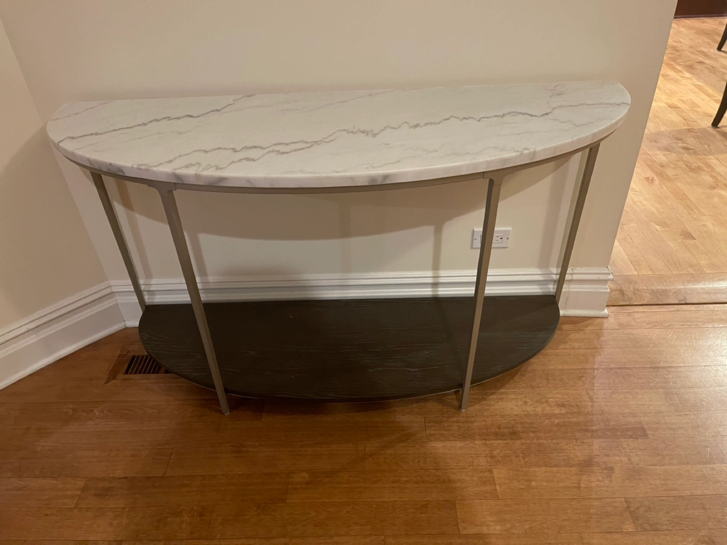 Brand new , never used, open box , Elegant half-round console table. Features a marble top and a lower shelf. Sleek metal legs. Perfect for entryway or living room.