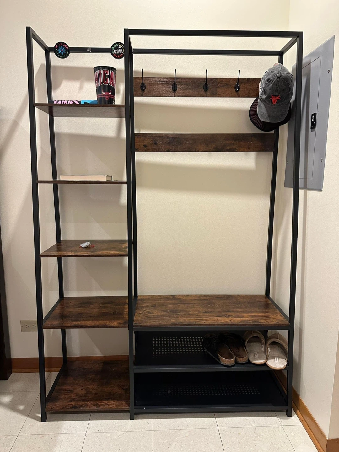 10I'm selling a hall tree with a storage bench. It's a great piece for entryways or bedrooms. It combines a coat rack, shelves, and a bench for shoe storage. The shelves have a wood grain finish, and the frame is metal. It's in great condition and ready for a new home!