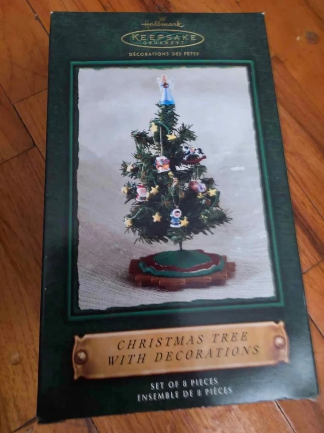 23Selling a Hallmark Keepsake Christmas tree with decorations! The set includes 8 pieces and comes with the original box. Also included are several other Hallmark ornaments such as Mary's Bears, a 1917 Curtiss JN-4D Jenny, a Jingle Bell, and a 1936 Custom Biplane. There is also a box of Tiny Lites included