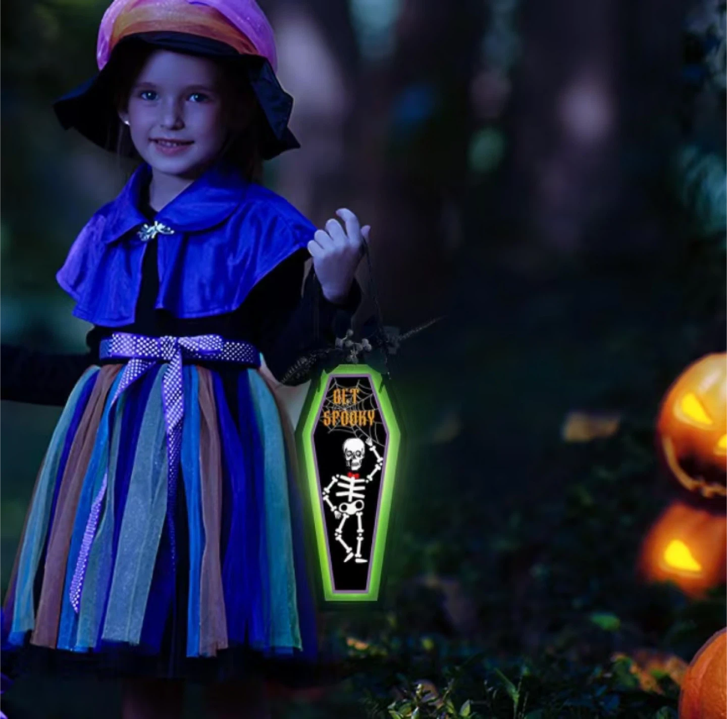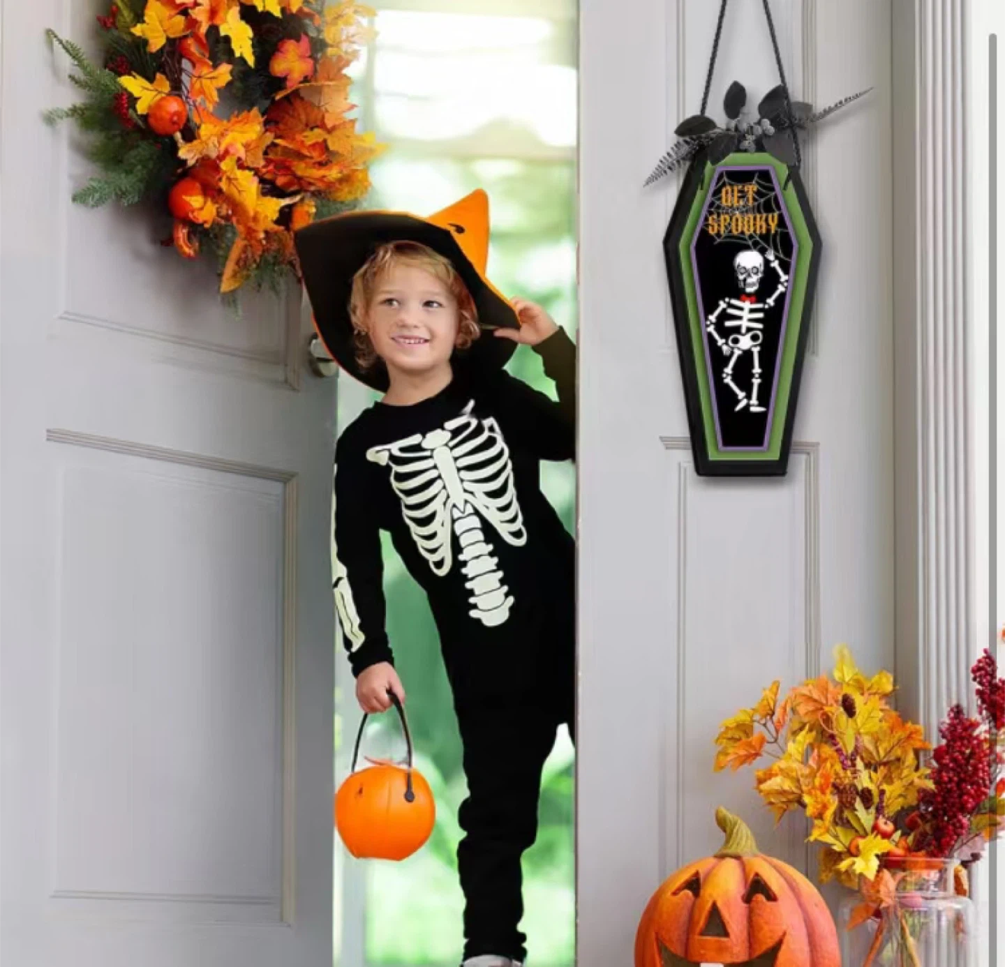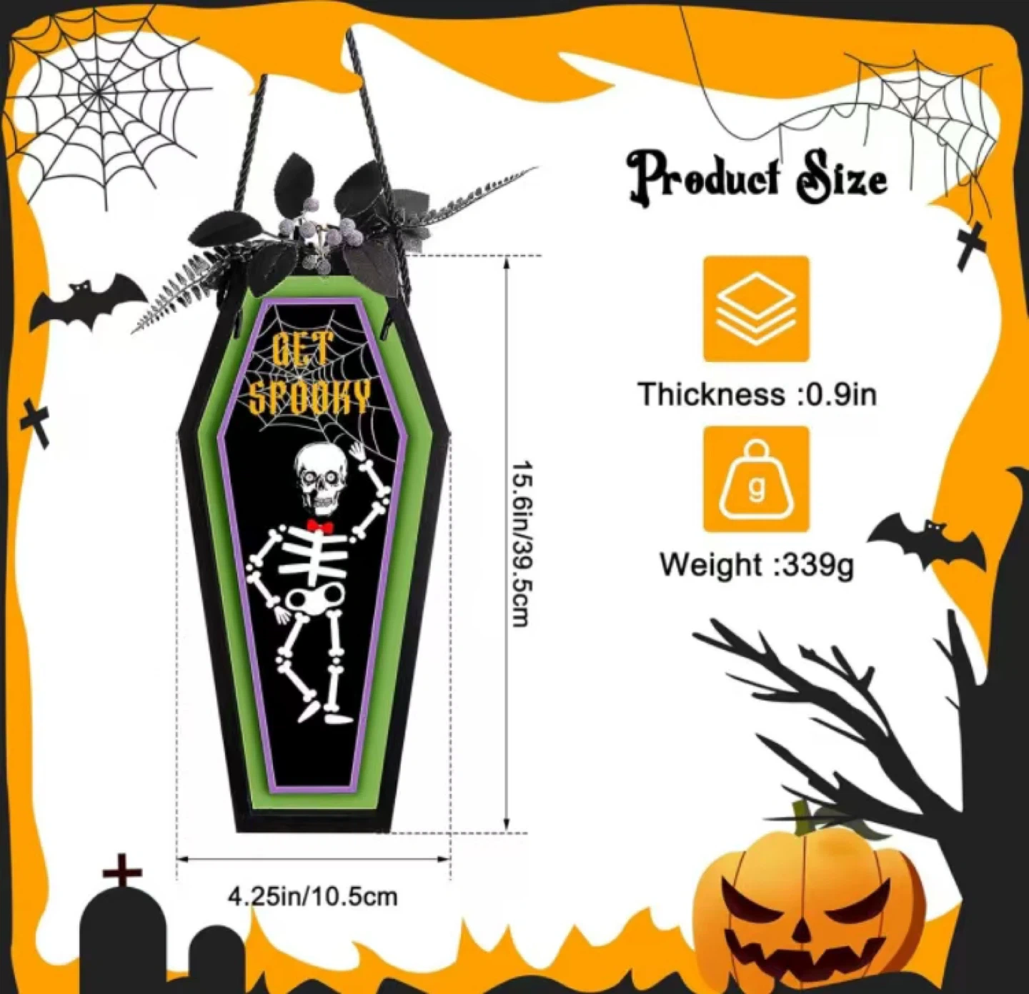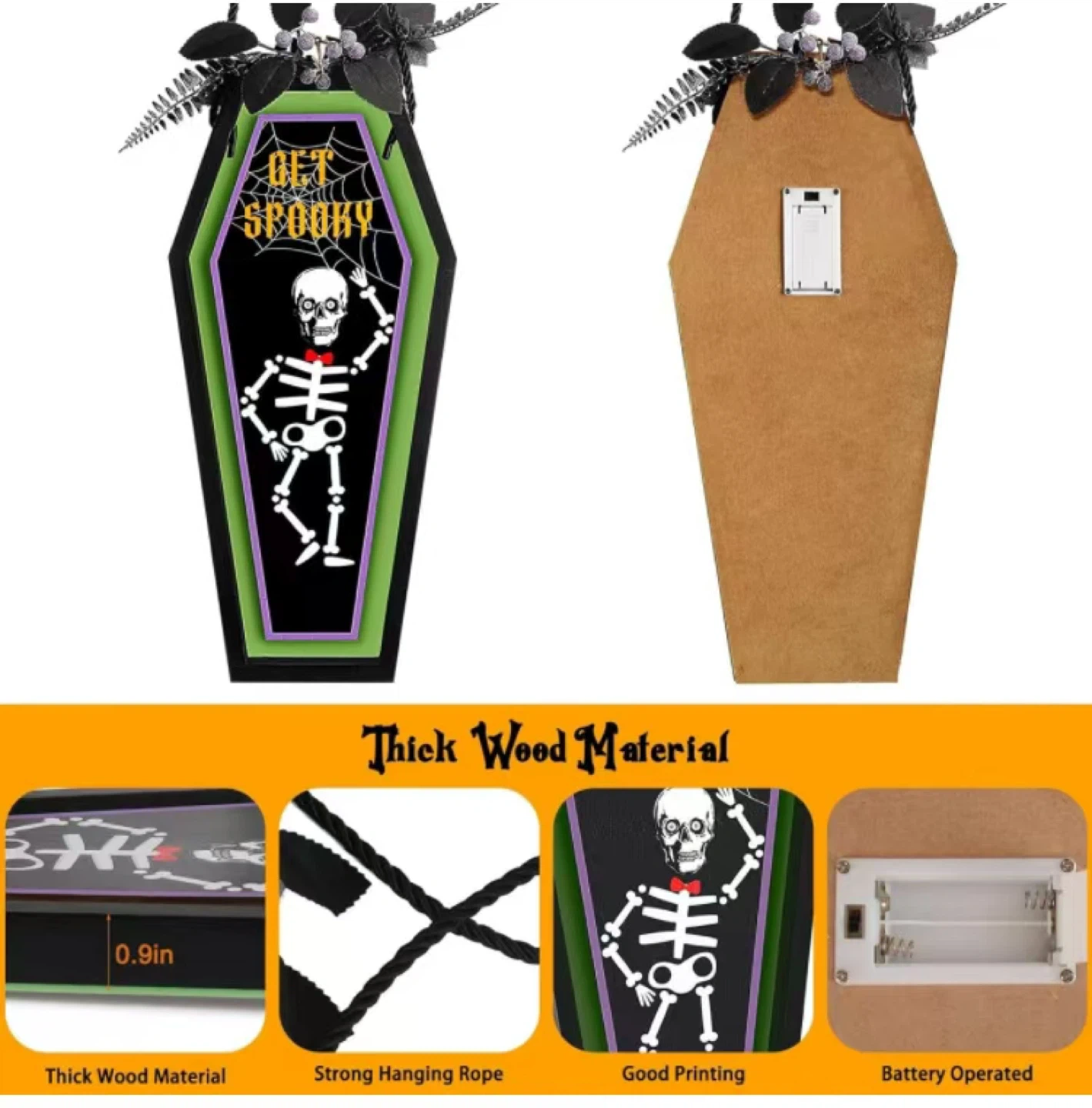 60Halloween Led Coffin Door Sign lights, Halloween Wreaths for Front Door, Light Up Skeleton Scary Pumpkin Lamp, Seasonal Hanging Plaque for Porch Wall Yard, Indoor Outdoor Halloween Decoration (Green)