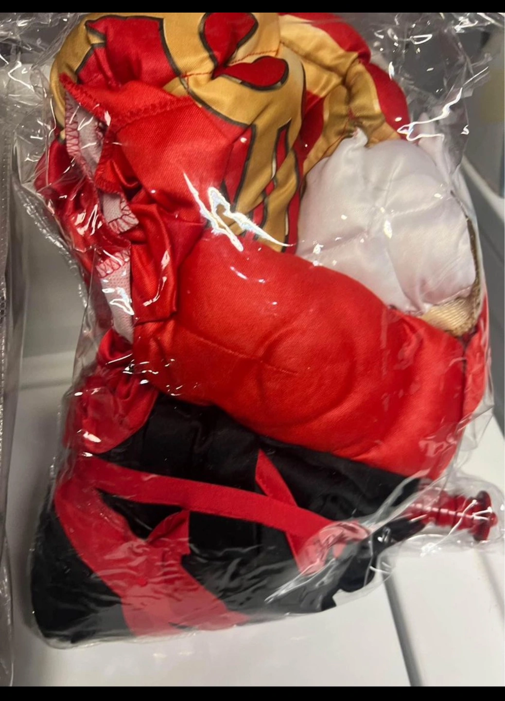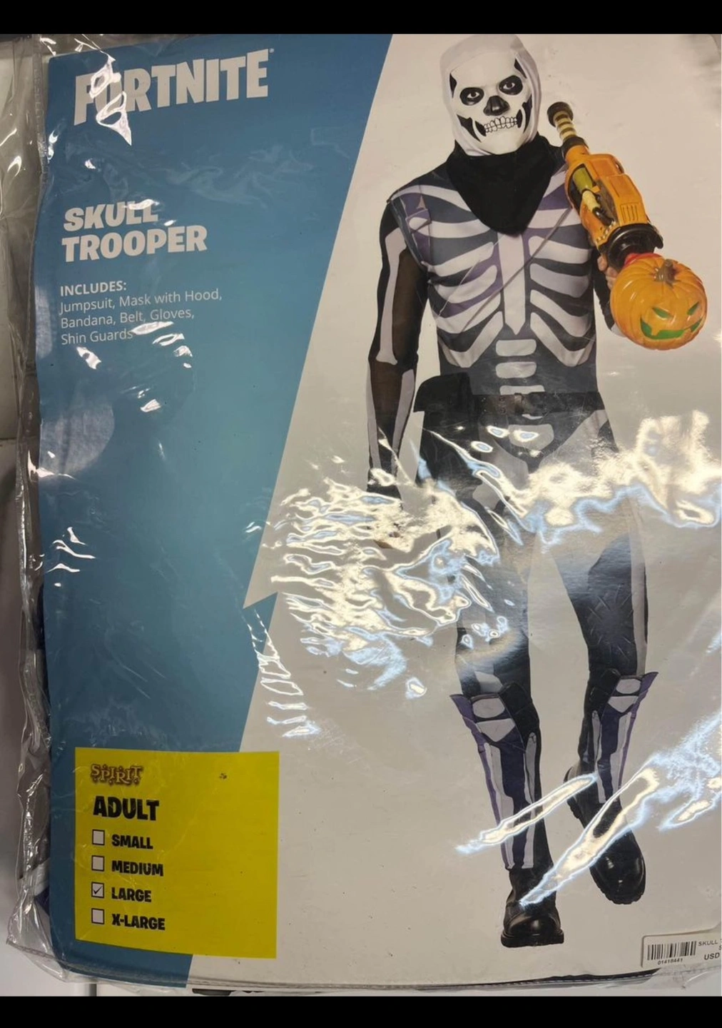 10Four Halloween costumes in various sizes, including the Fortnite Skull Trooper costume, a Spirit of Terror costume, a Kakashi costume from Naruto, and a Queen of Hearts costume.power ranger large kids size