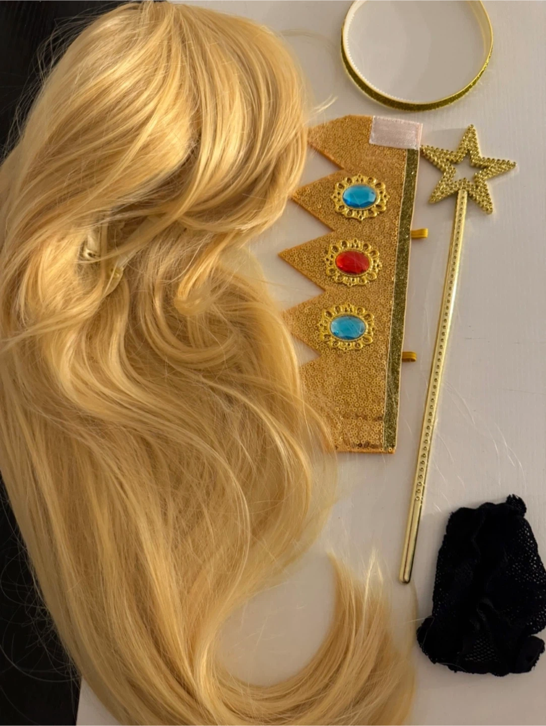 Selling a costume wig with a crown and other accessories. Perfect for dress-up or Halloween!π