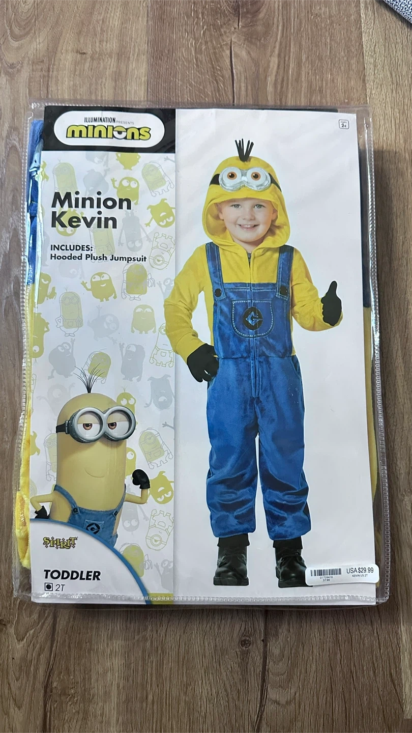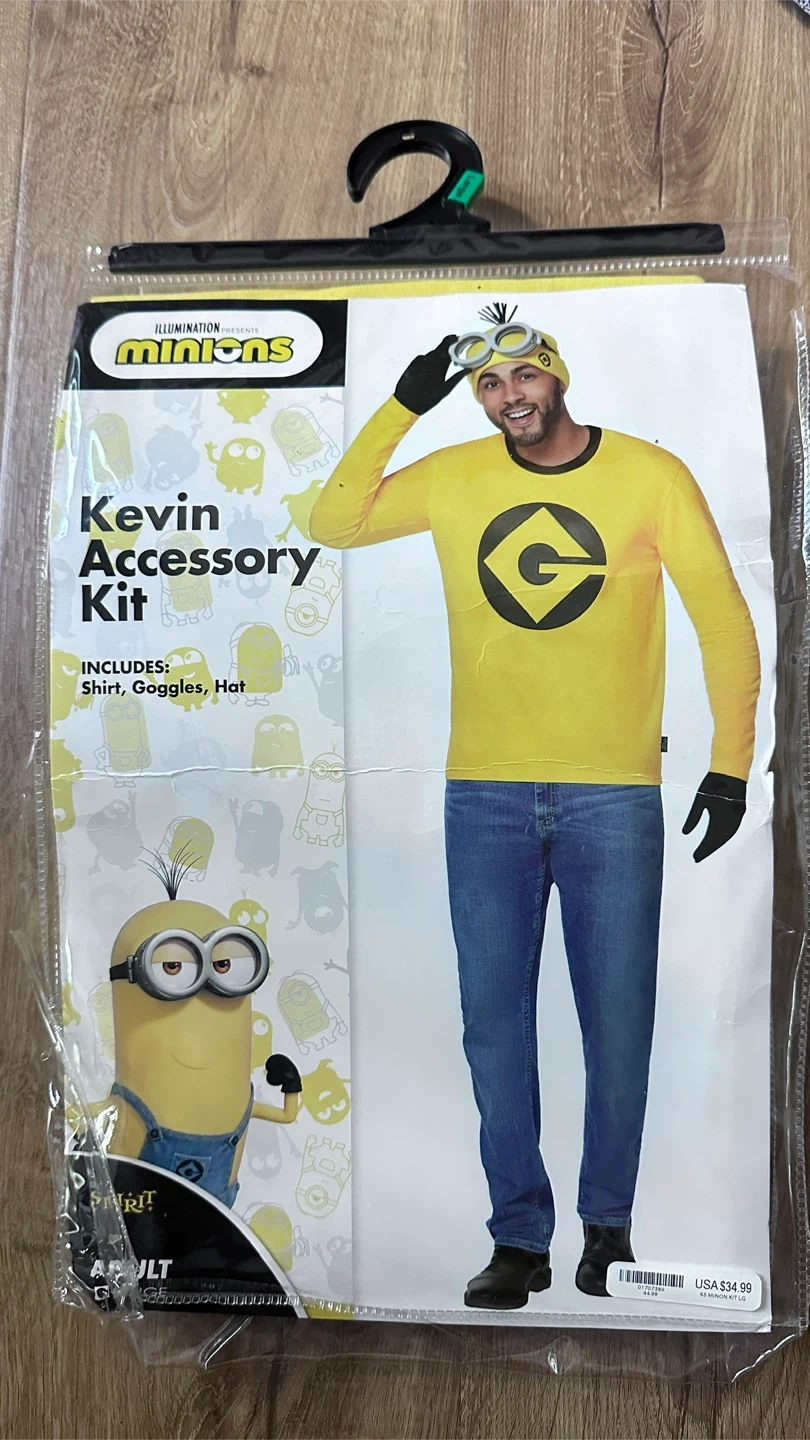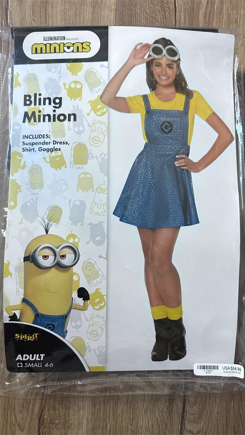 Minion costumes for the family, men's size L (includes shirt, gogless, hat), women's size S (includes suspender dress, shirt, and gogless), and children's size 2T (includes hooded plush jumpsuit). Everything in perfect condition and clean, taken to the laundry