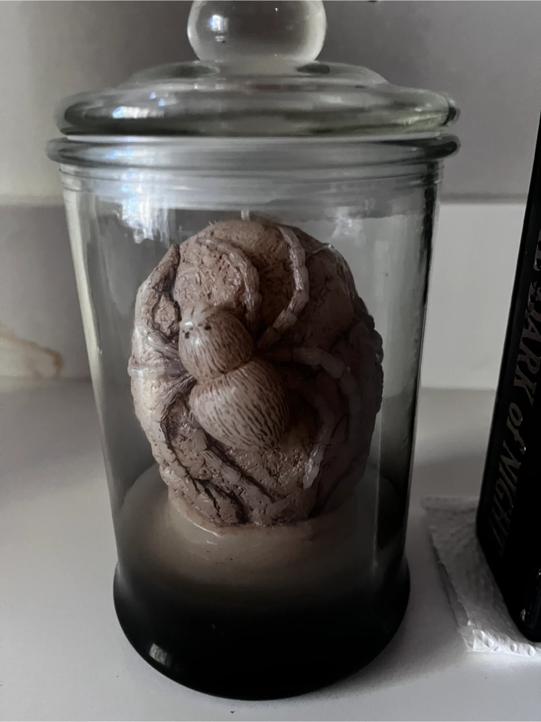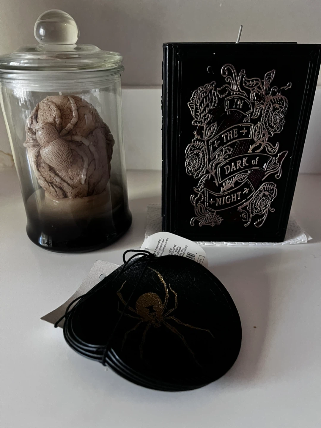 Selling some Halloween decorations! There is a candle, a spider in a jar, and some coasters. Perfect for adding some spooky vibes to your home