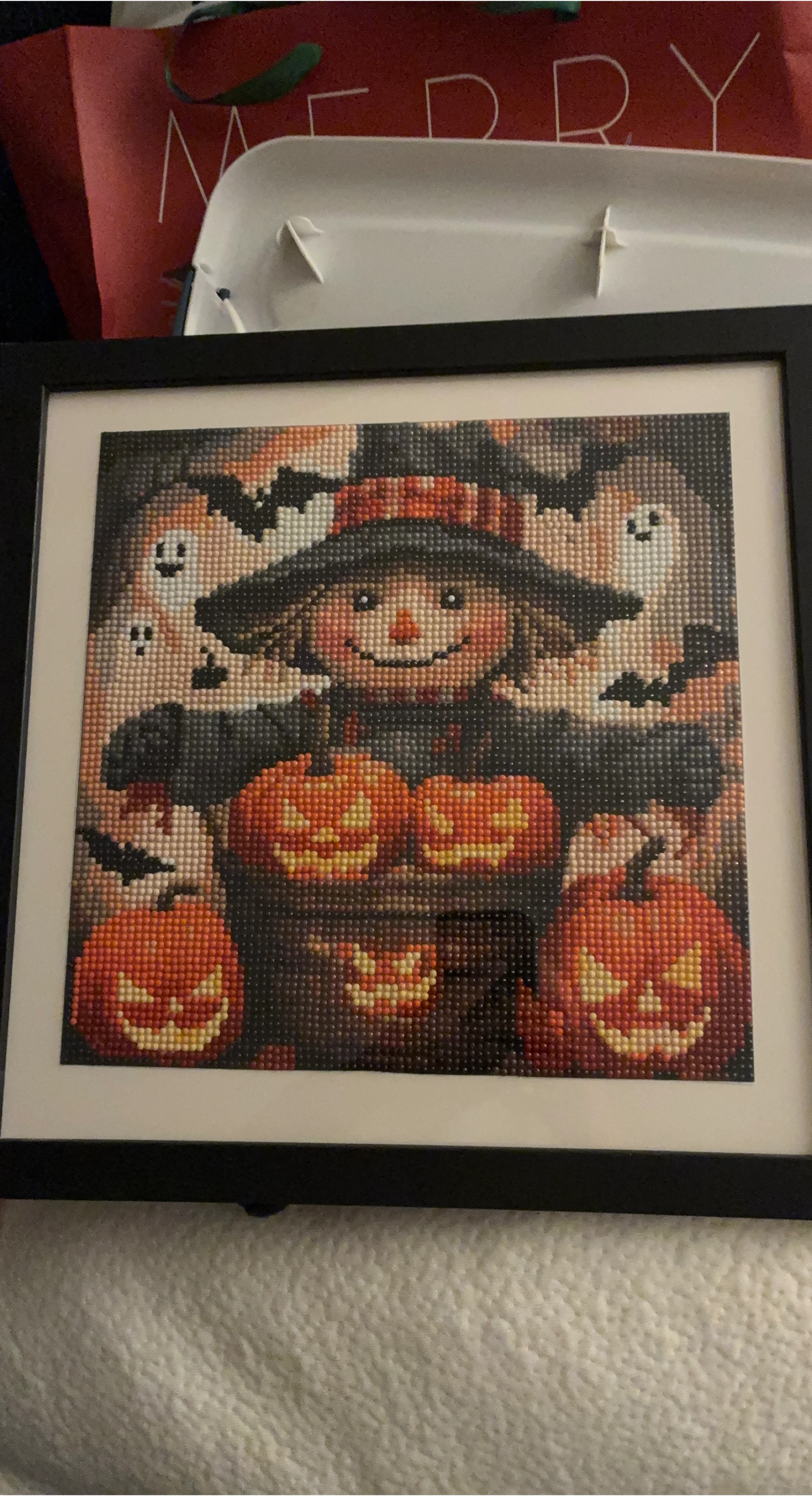 Halloween themed diamond art in a black frame. Perfect for adding a spooky touch to your home decor!