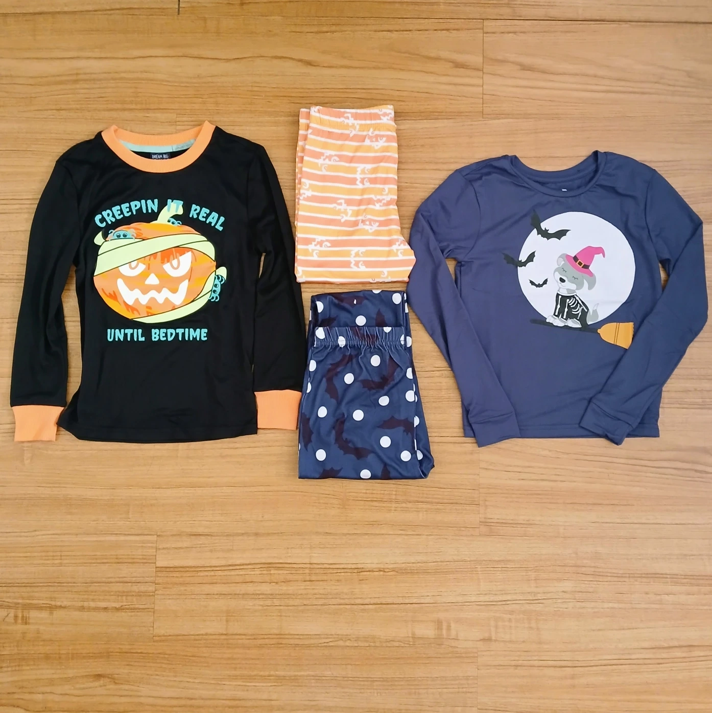 Halloween themed pajama sets! One set is black with a pumpkin design and the other is blue with a dog on a broomstick design. Includes two pairs of pants, one with bats and polka dots and the other with orange stripes