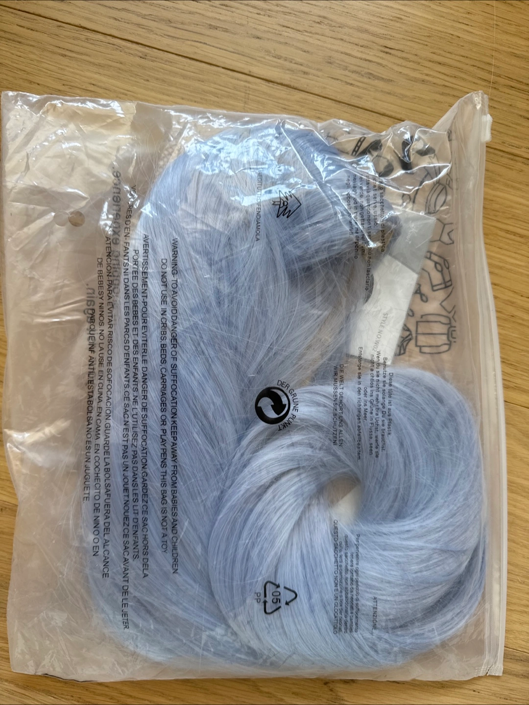 126Long, light blue wig. New, in original packaging. Perfect for adding a pop of color to your hairstyle.
