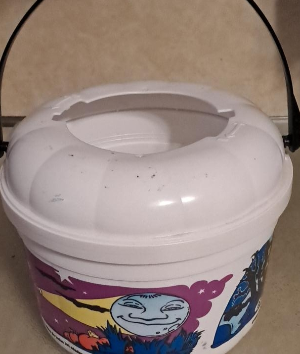 Selling a Halloween pumpkin bucket with a handle. It's white with Halloween-themed graphics on the side. It appears to be in used condition.🧡