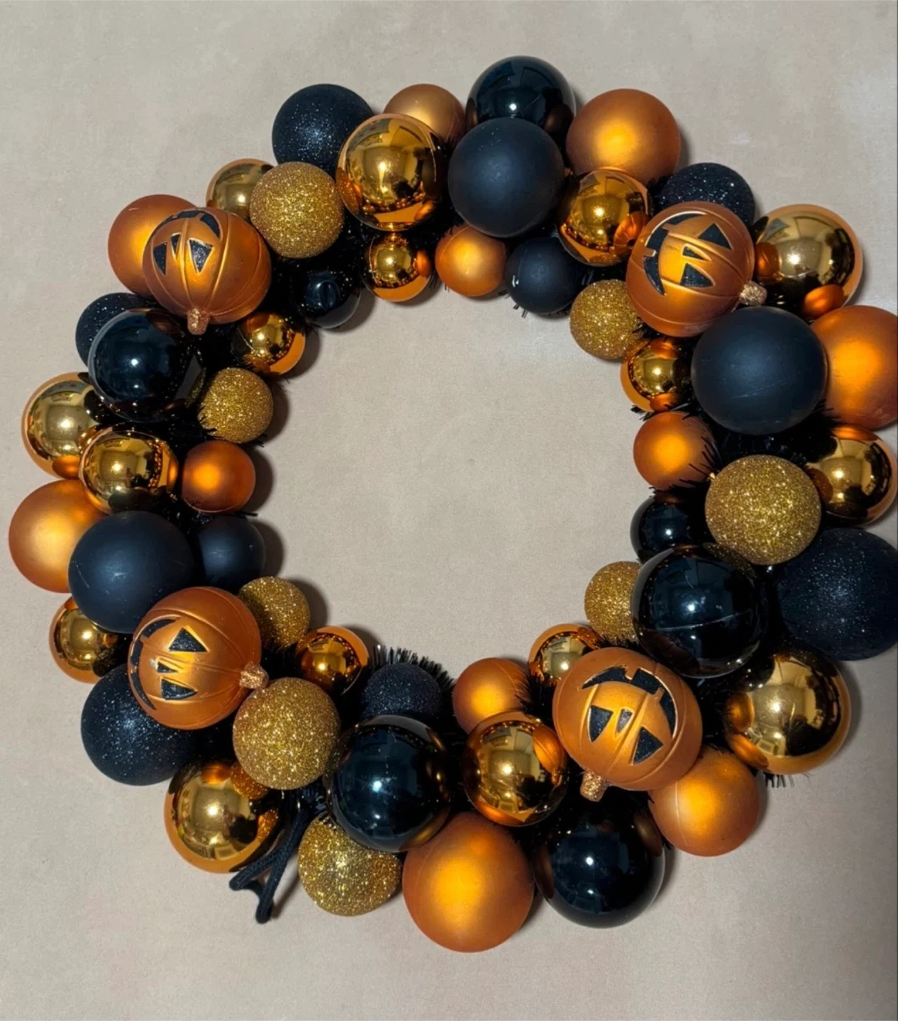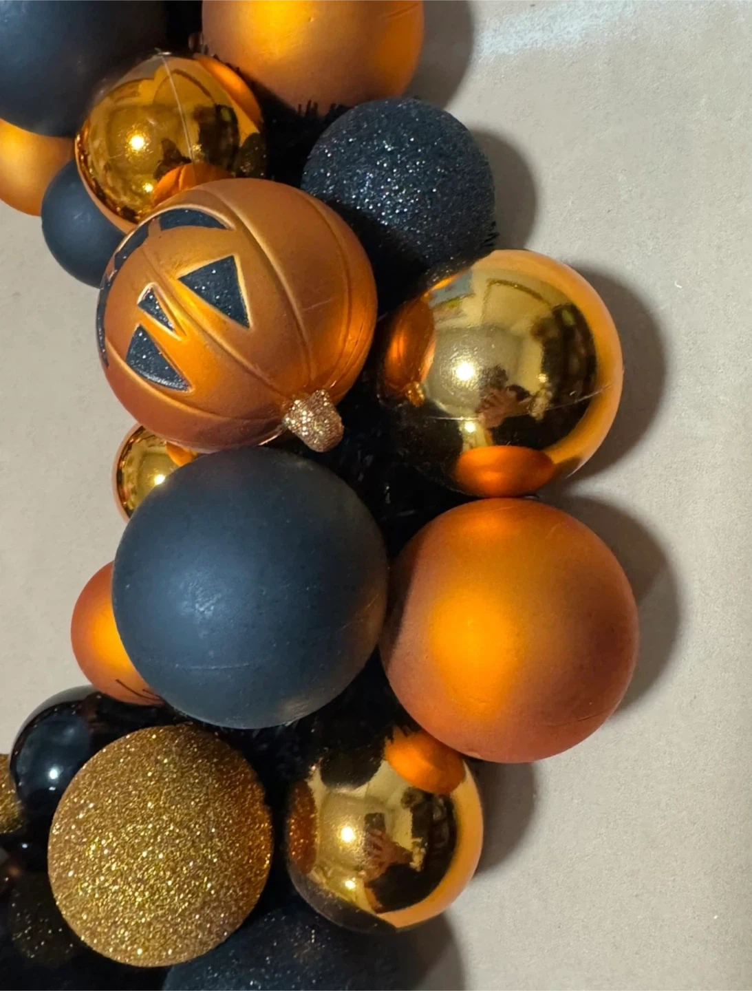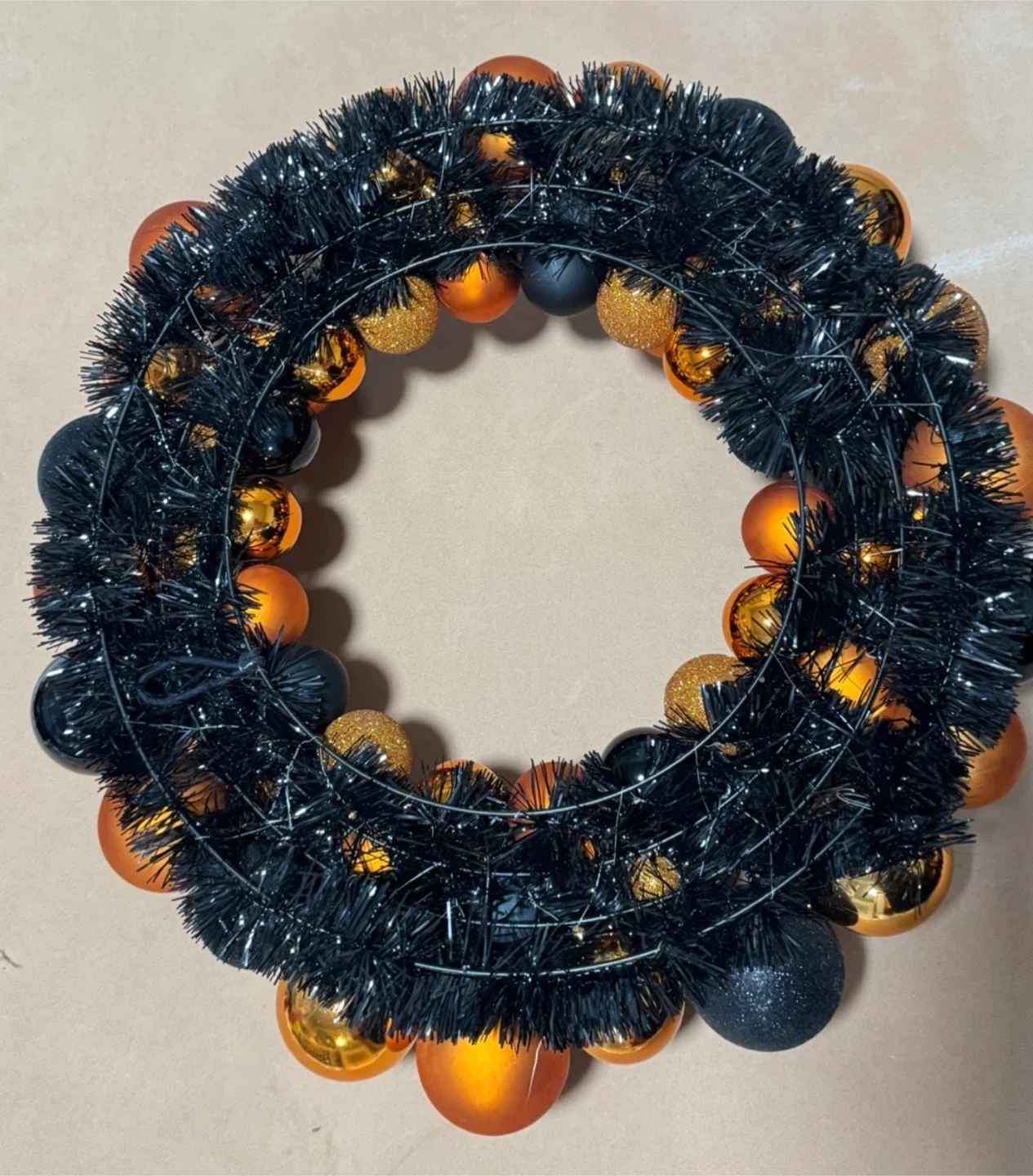 163Festive Halloween wreath with black tinsel and assorted ornaments in black, orange, and gold! Perfect for adding a spooky touch to your front door or indoor decor!