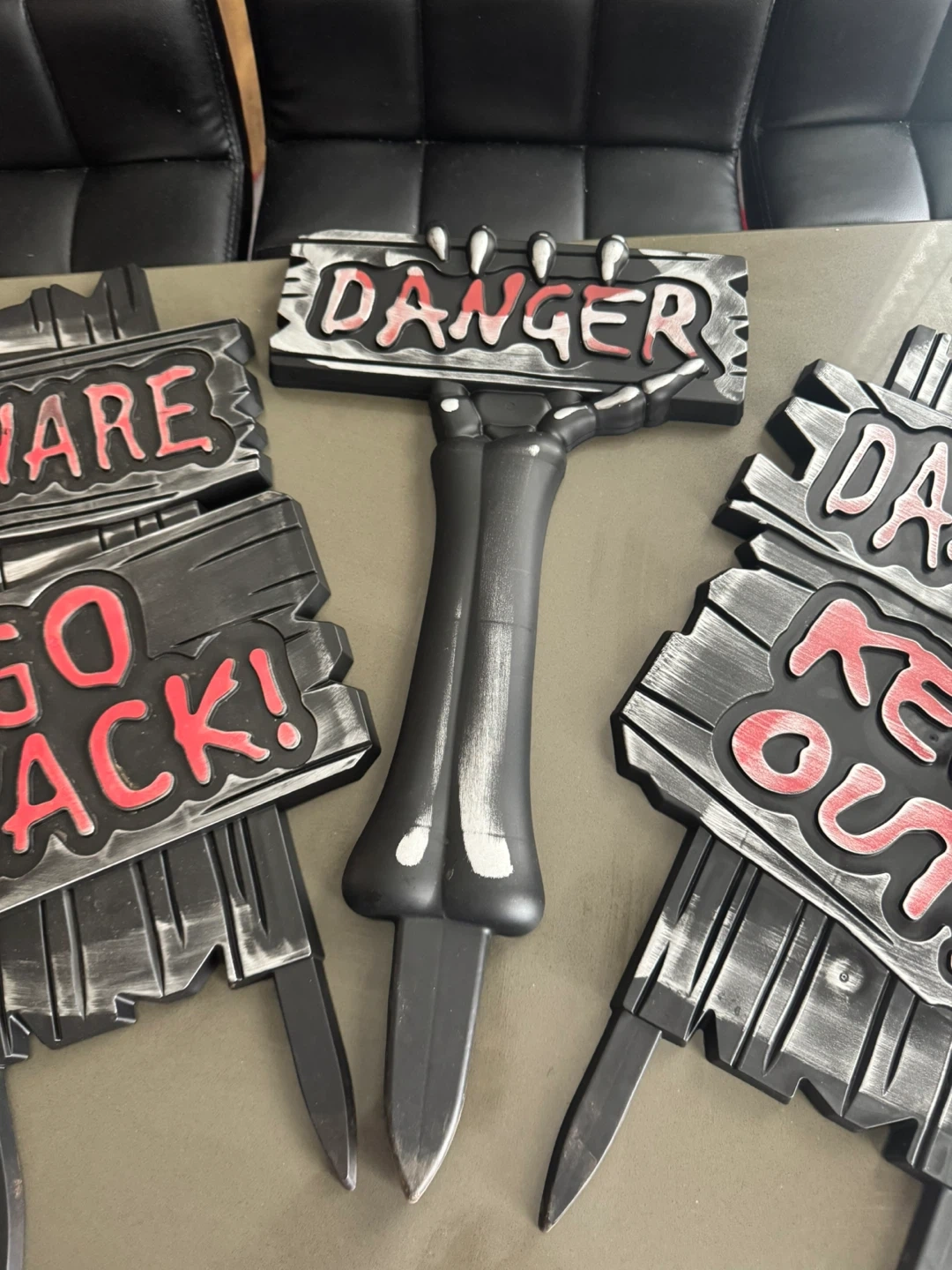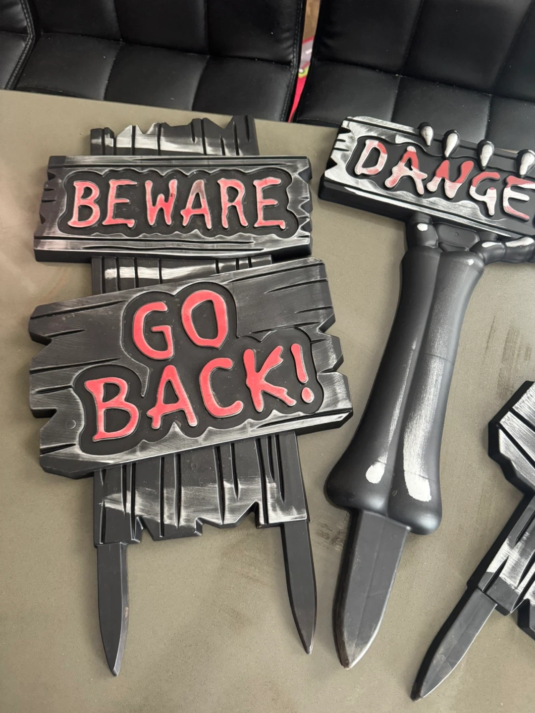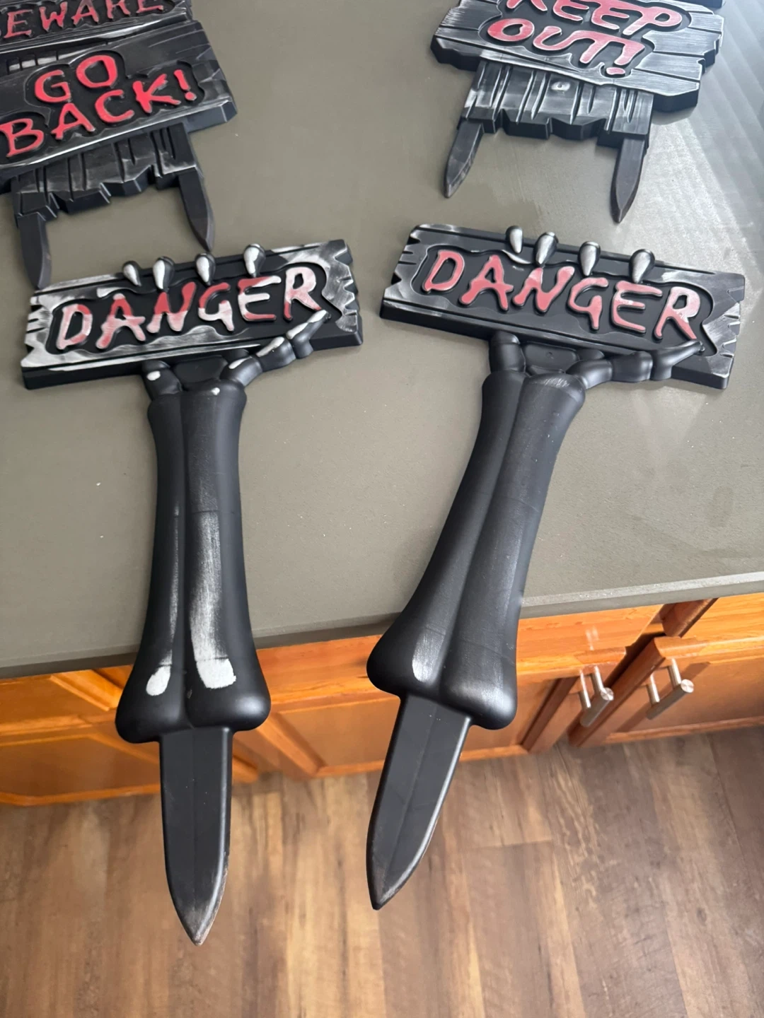 178Selling some fun Halloween yard signs! They say things like 'Danger' and 'Beware'. Perfect for adding a spooky touch to your yard this Halloween season 2 skeletons that glow in the dark. Measure about 2ft 10 inches once straightened out