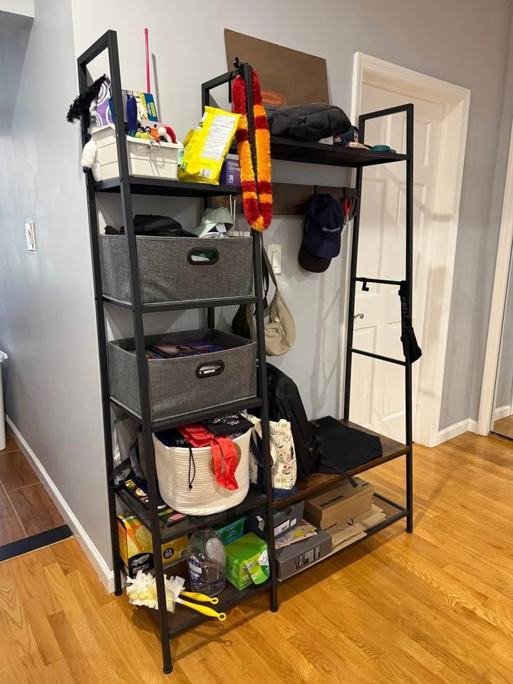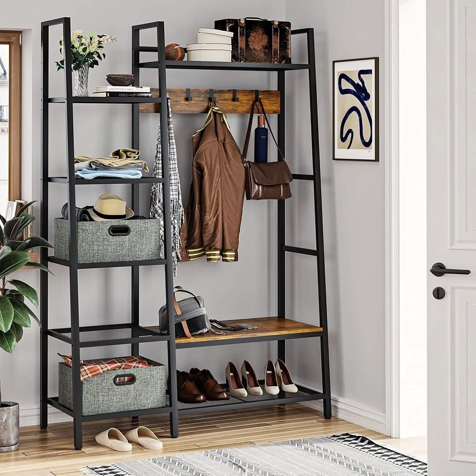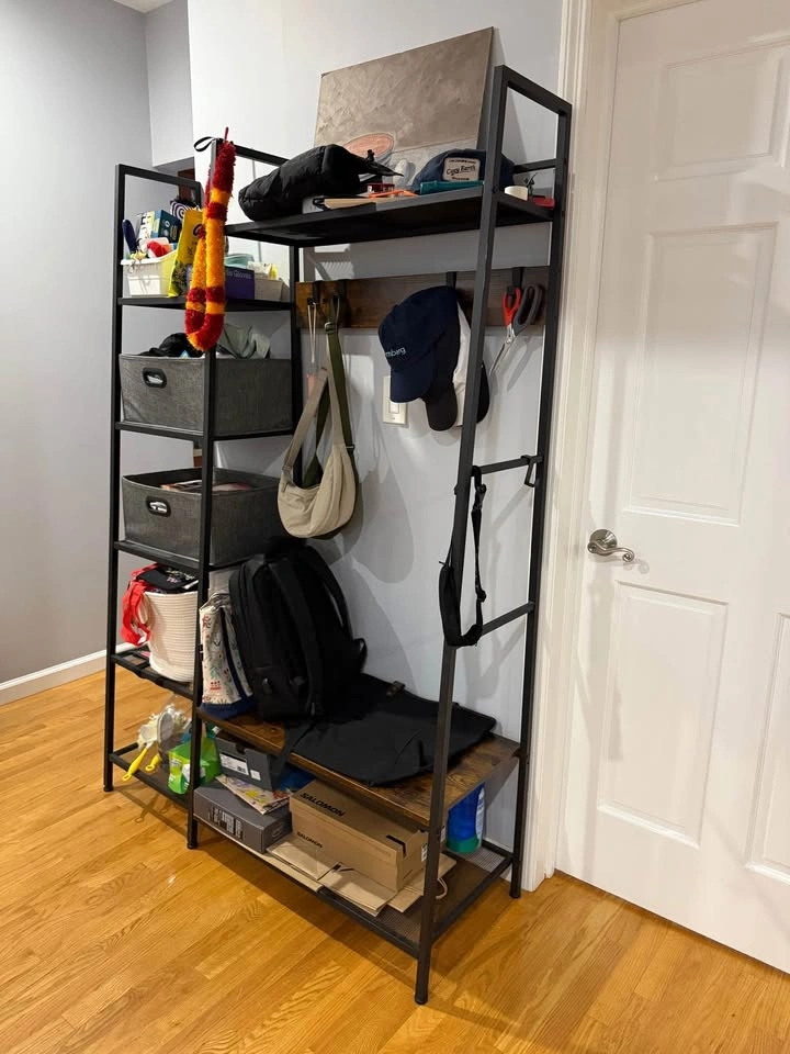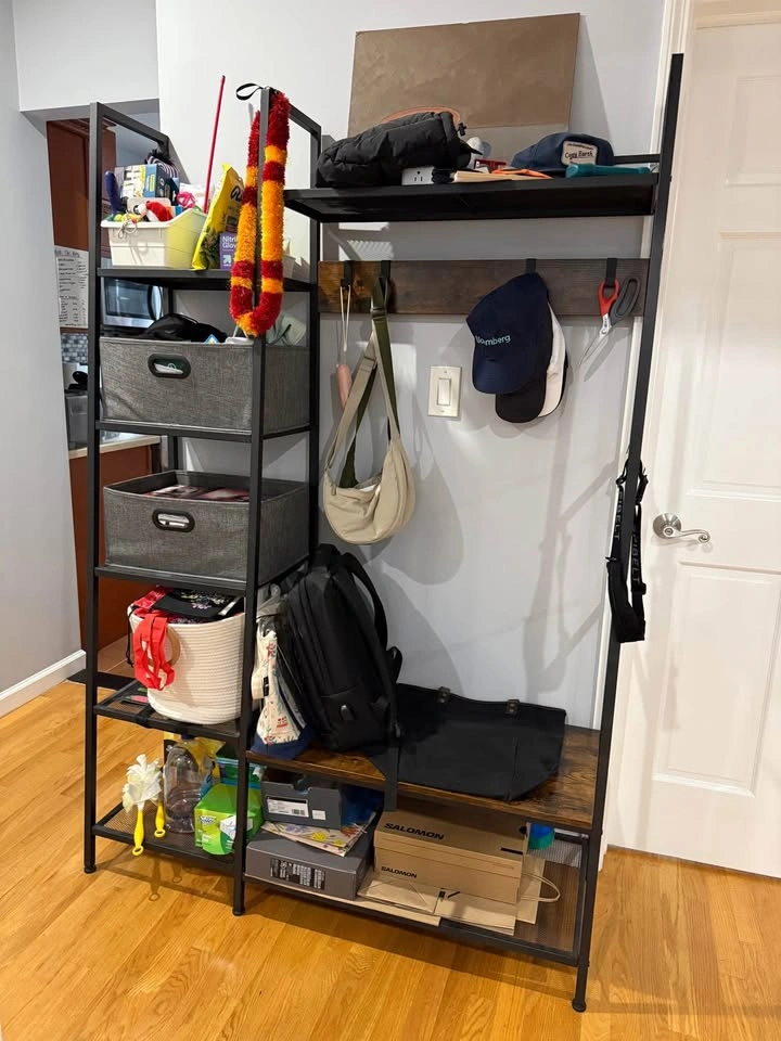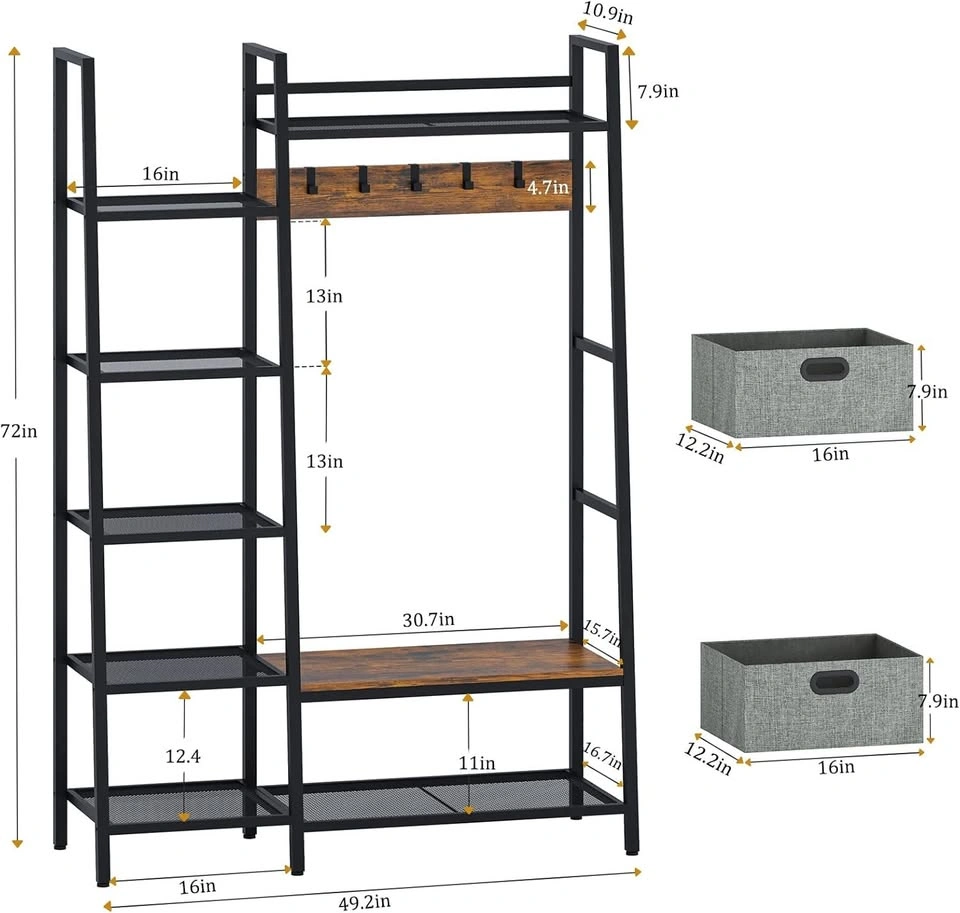 Industrial accent hallway/entryway storage bench + shelf + coat rack. Comes with 2 foldable storage cubes and 5 moveable hooks. Dimensions: 49.2 x 16.7 x 72 Inch You'll need 2 people to take it down one flight of stairs.