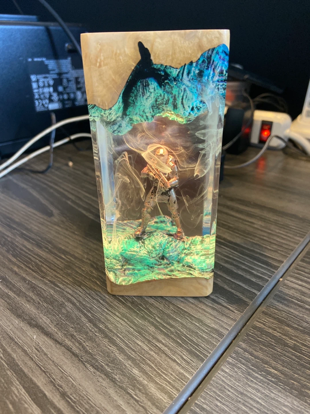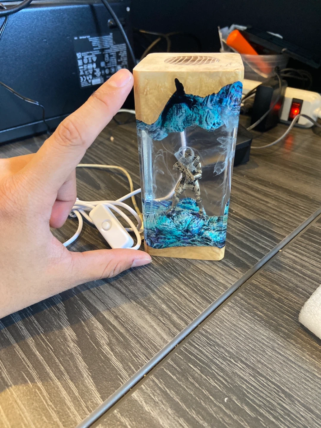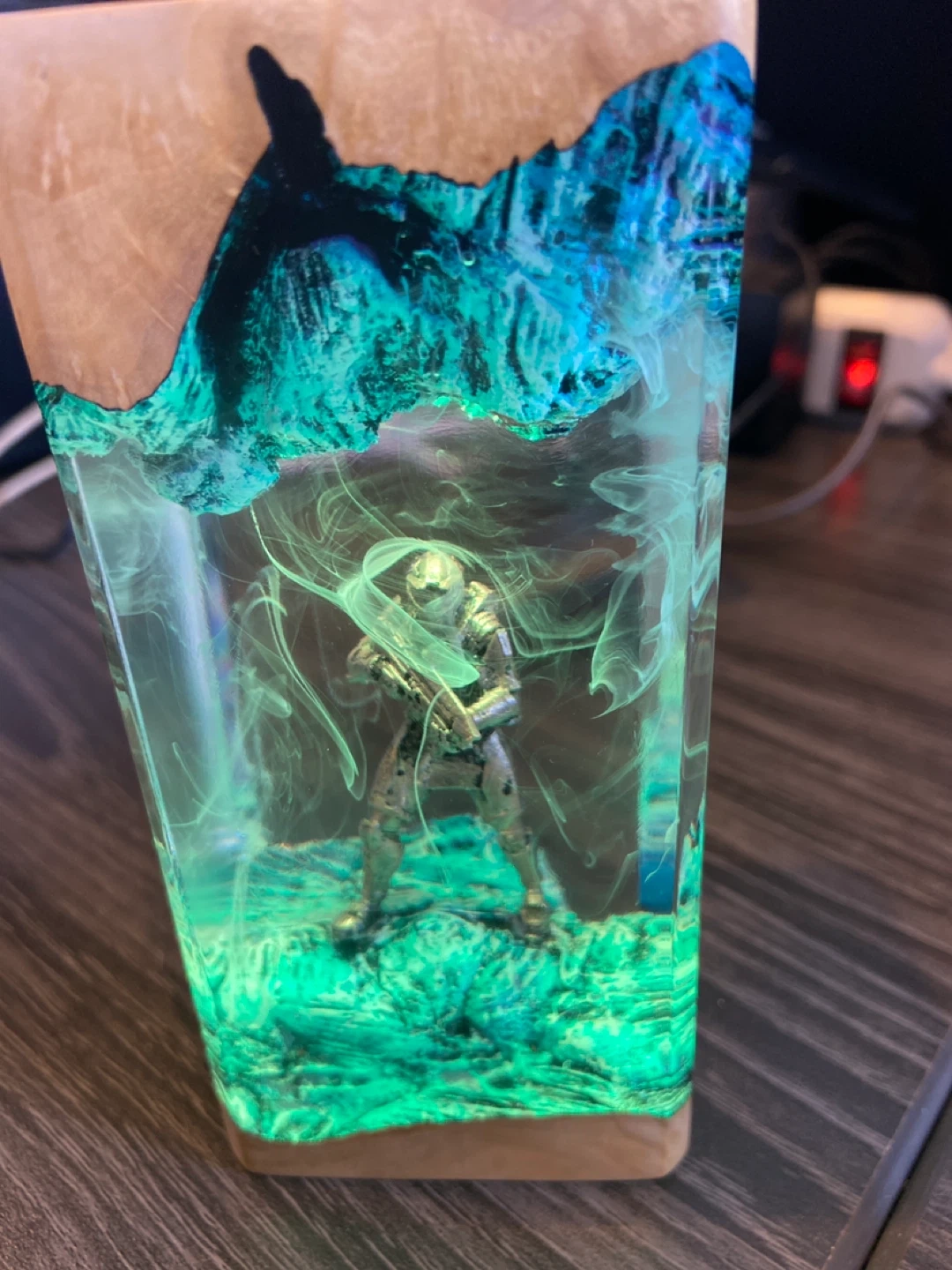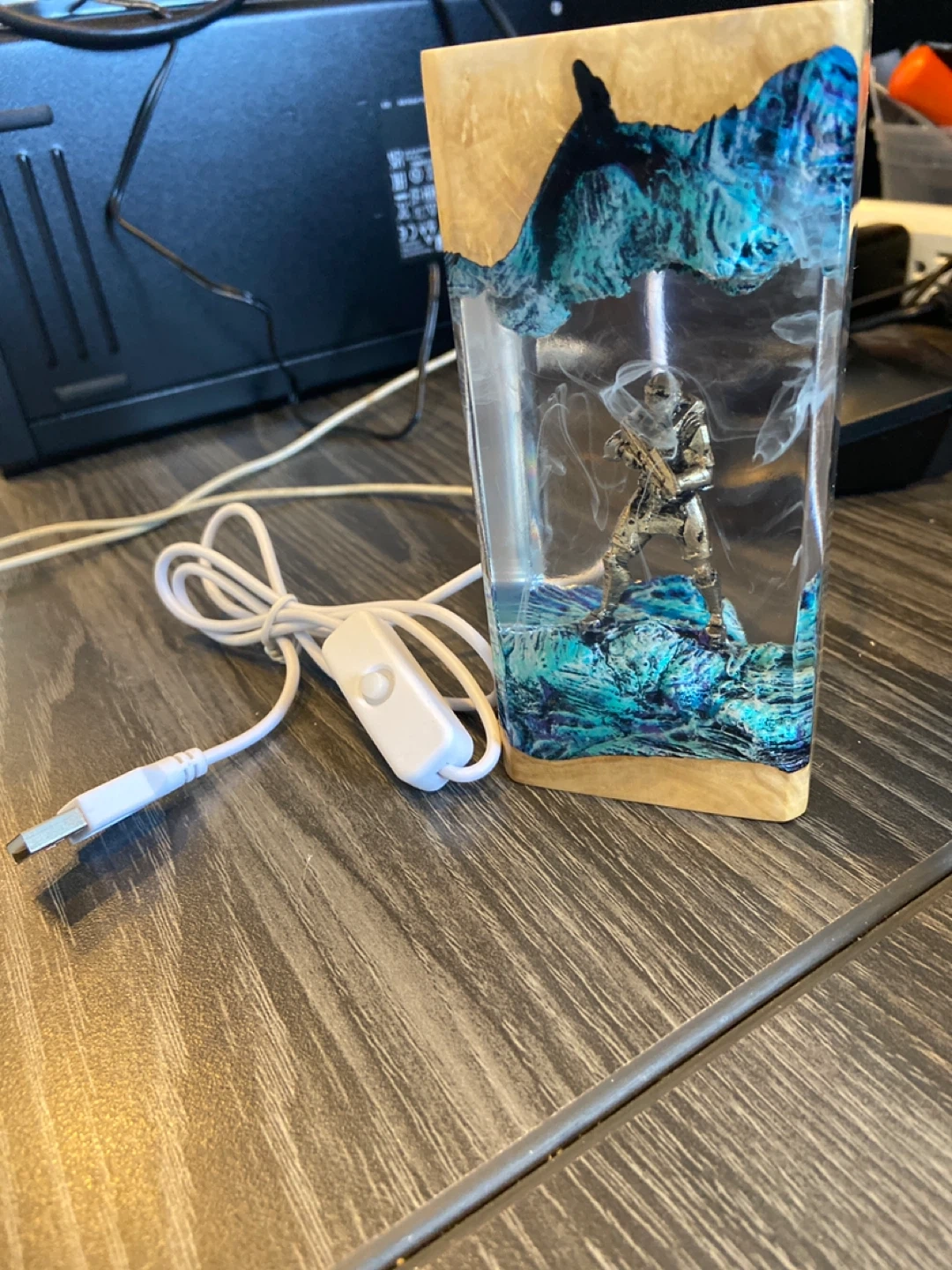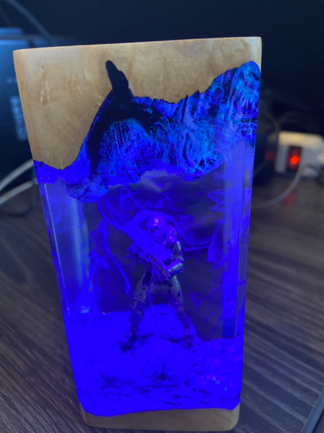 Check out this unique Halo Master Chief resin lamp! It features a cool design with the Master Chief figure encased in resin with a wood base and top. It comes with a USB cable for power. Perfect for any Halo fan!