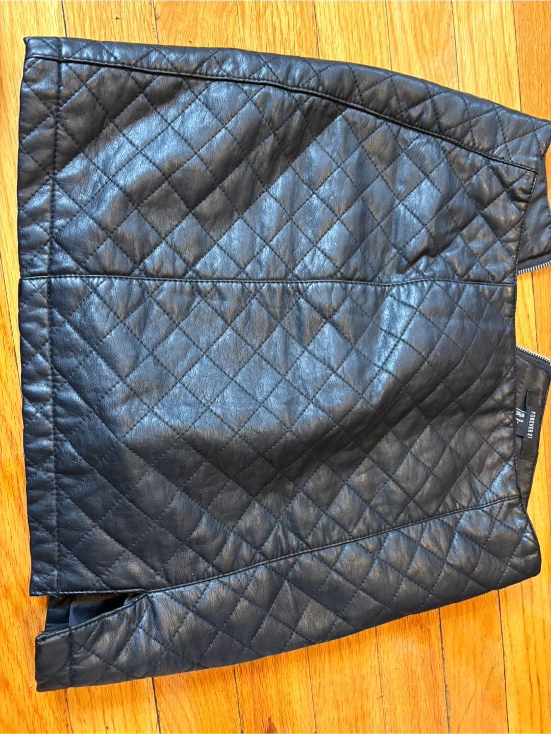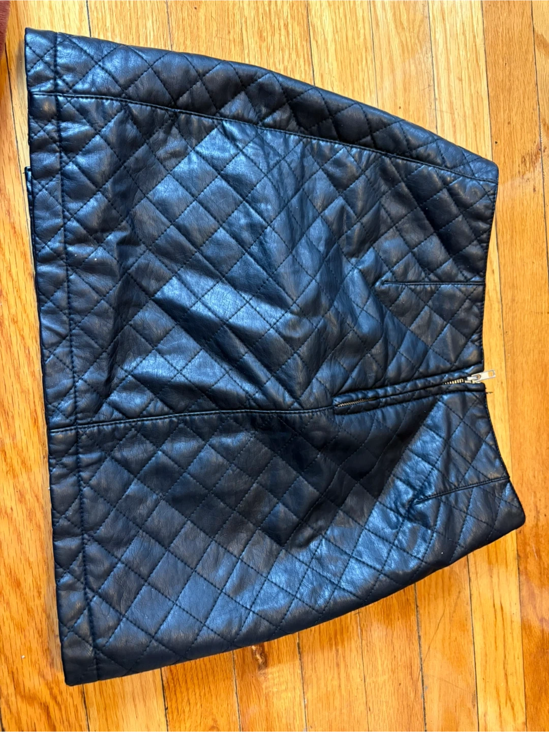 This black faux leather skirt features a diamond quilting pattern. It has a zipper closure in the back. Skirt material is faux leather.