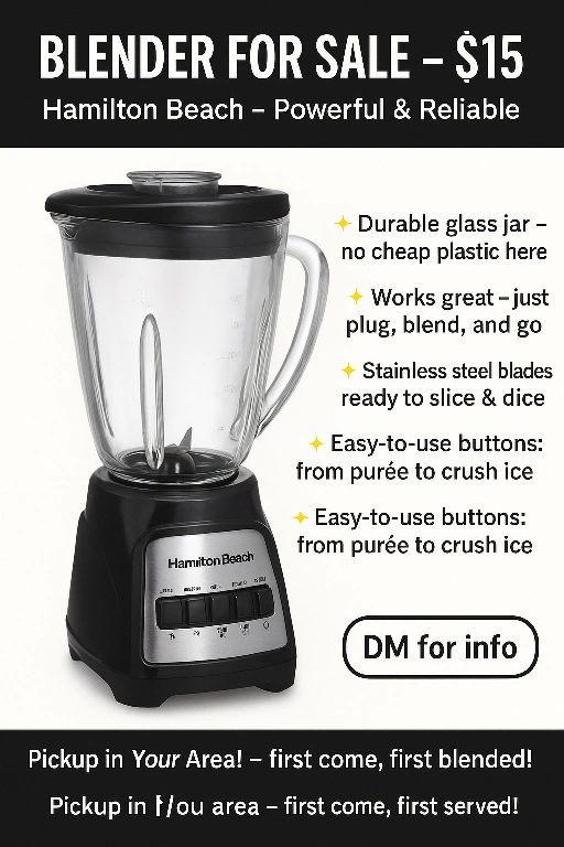 Selling a Hamilton Beach blender! It's powerful and reliable, perfect for all your blending needs. It features a durable glass jar, so no cheap plastic here! It works great - just plug, blend, and go. Stainless steel blades are ready to slice & dice. Easy-to-use buttons: from purée to crush ice
