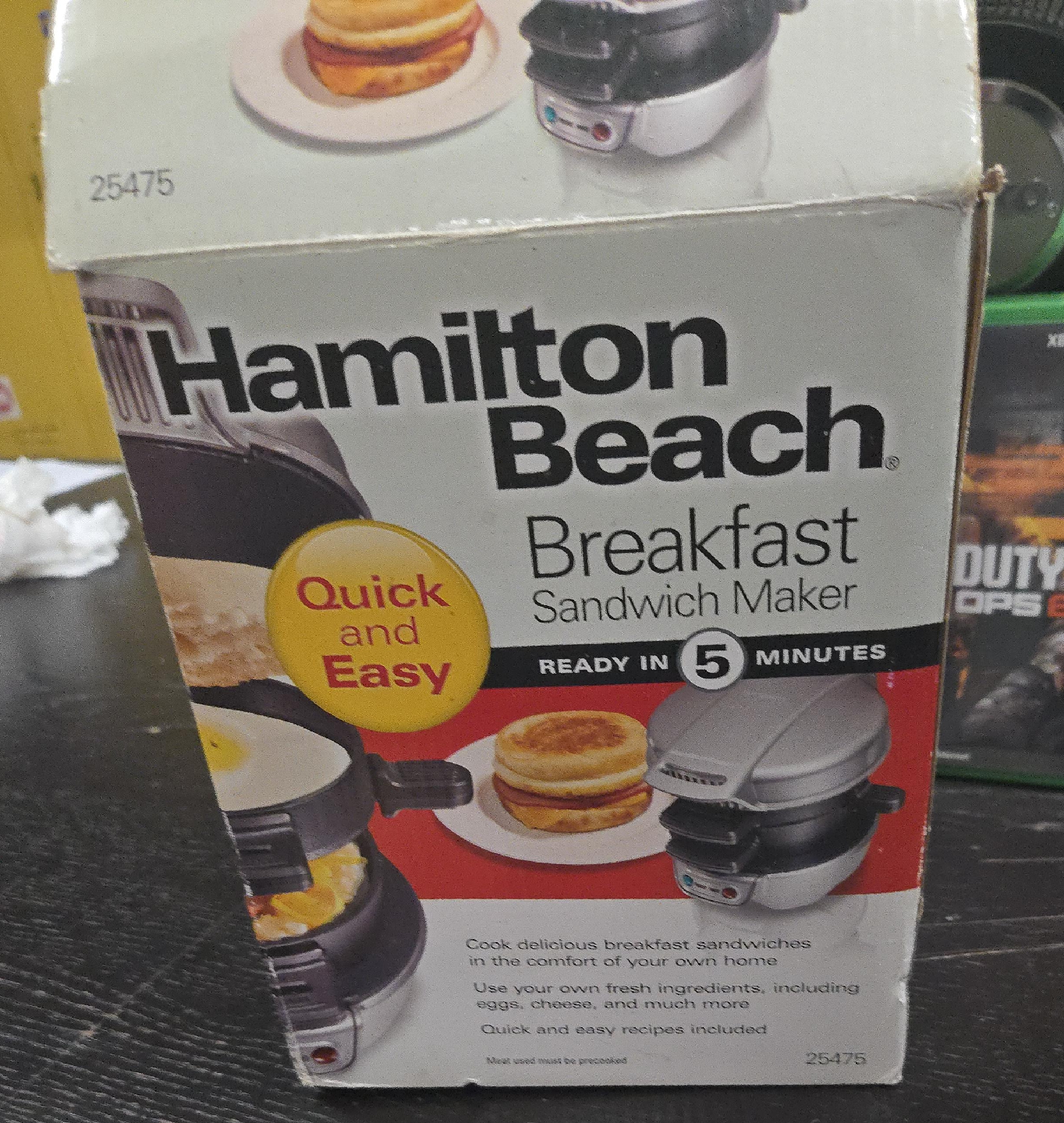 I'm selling a Hamilton Beach Breakfast Sandwich Maker. Cook delicious breakfast sandwiches in the comfort of your own home! Use your own fresh ingredients, including eggs, cheese, and much more. It's quick and easy, ready in 5 minutes! Quick and easy recipes included