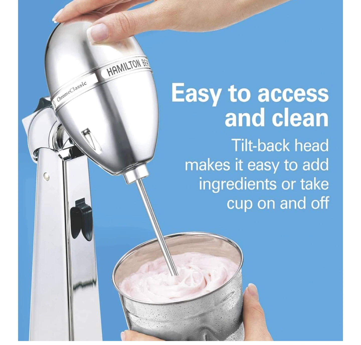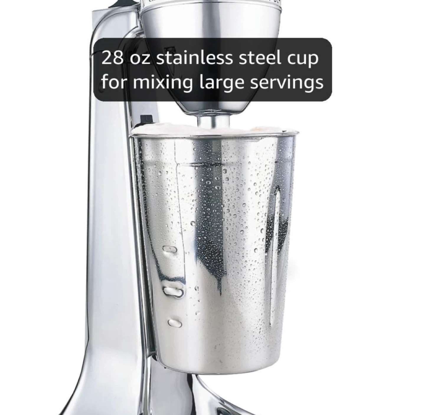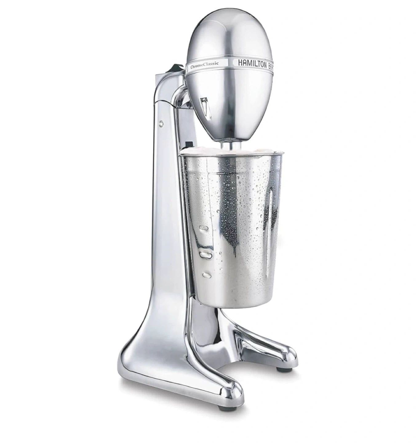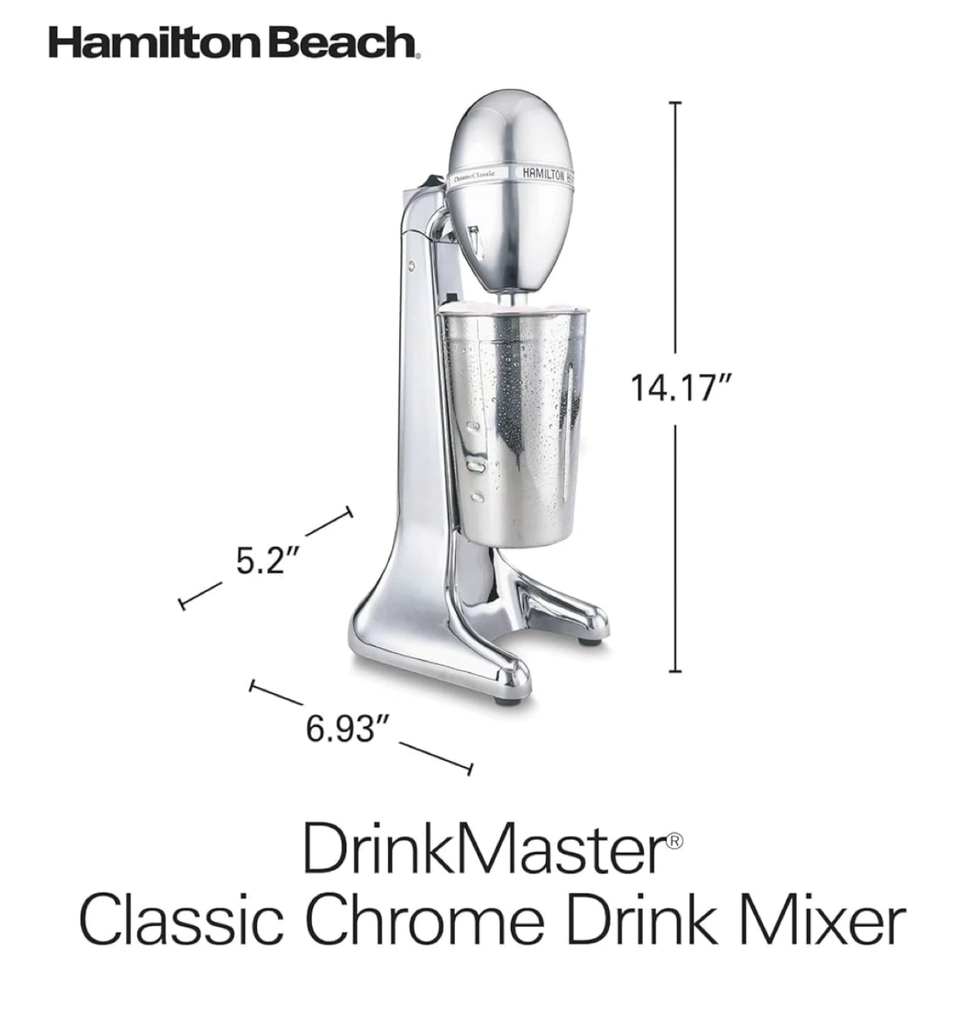Get ready to whip up some delicious treats with this Hamilton Beach DrinkMaster Classic Chrome Drink Mixer! It's in great condition and ready to use. - Easy to access and clean - Tilt-back head makes it easy to add ingredients or take the cup on and off - Includes a 28 oz stainless steel cup for mixing large servings - Dimensions: 14.17" height, 5.2" width, 6.93" depth