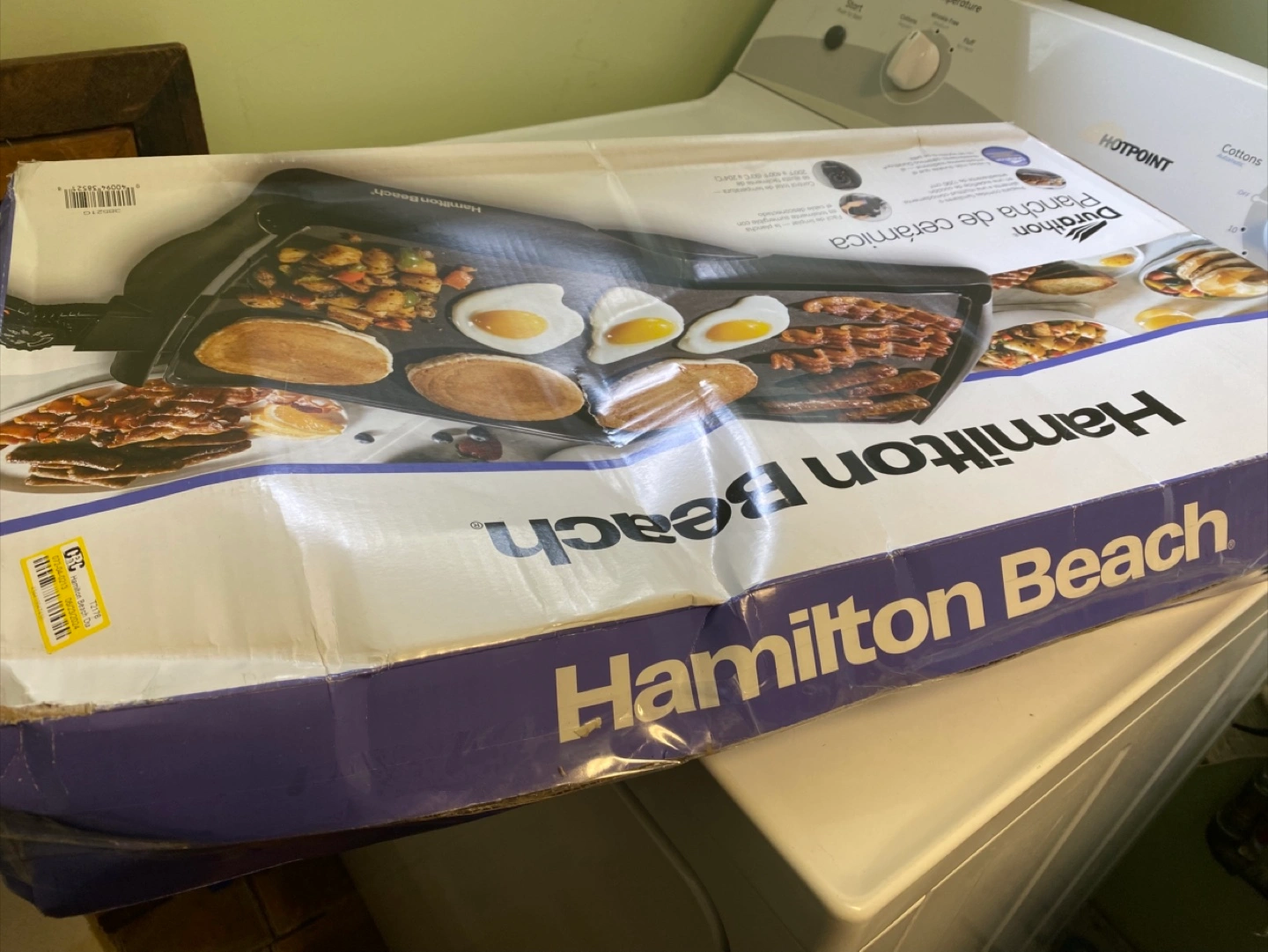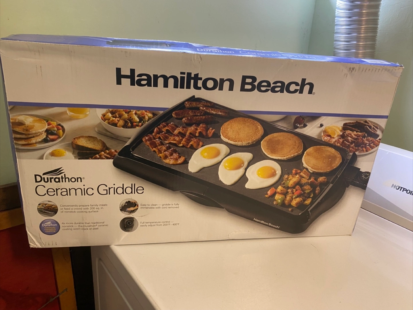 Selling a Hamilton Beach Durathon Ceramic Griddle! It's in great condition and comes with the original box. This griddle is perfect for making pancakes, eggs, bacon, and more. It's easy to clean and has a full temperature control that adjusts from 200°F to 400°F. It's more durable than traditional nonstick coatings and the ceramic coating won't crack or peel!