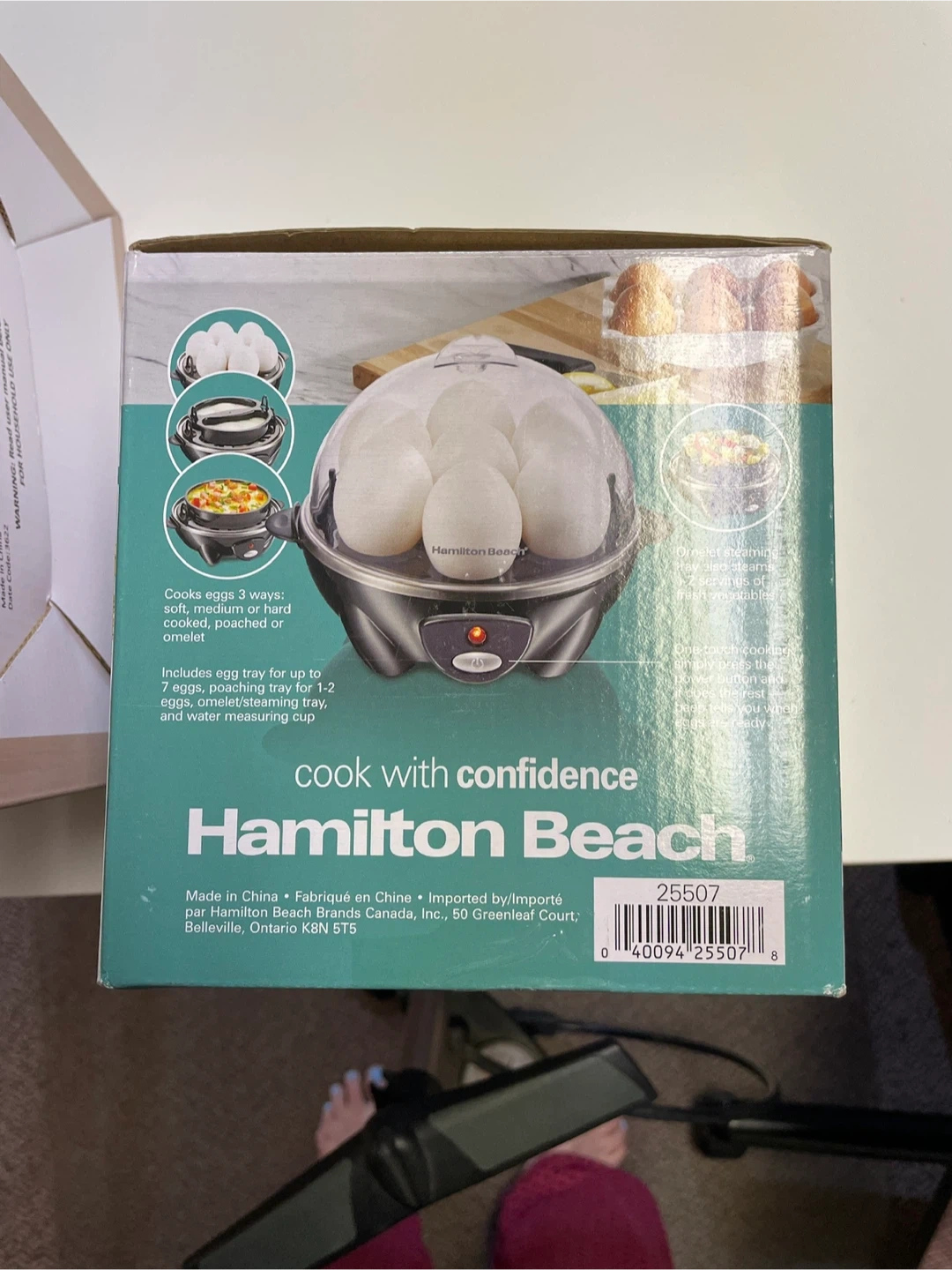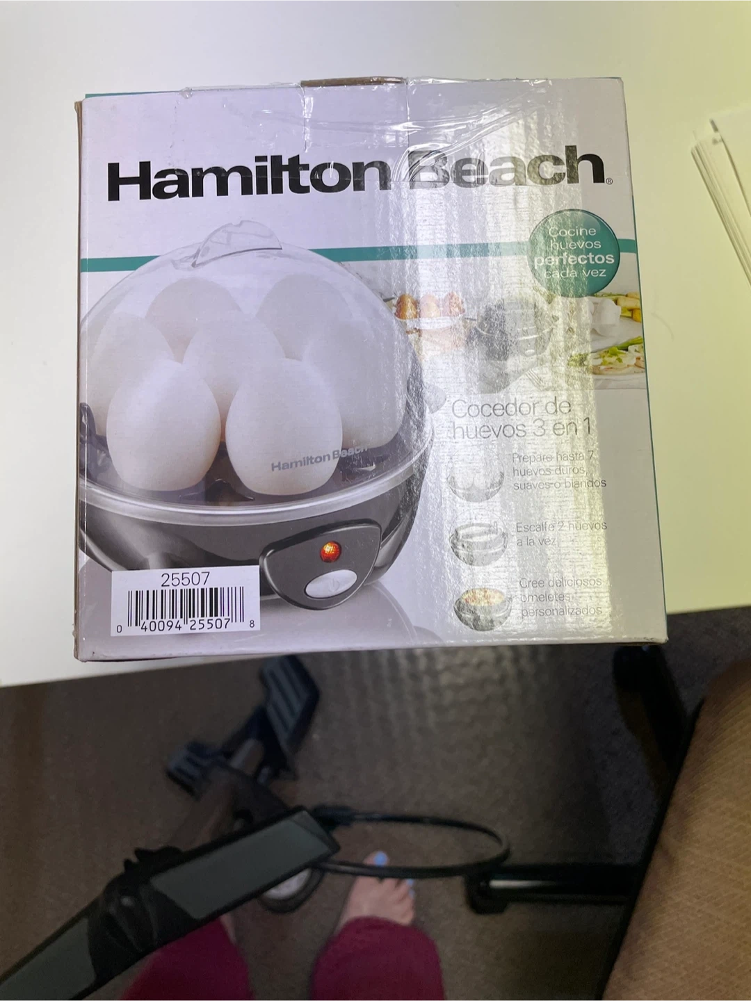 10I'm selling a brand new Hamilton Beach egg cooker, still in its original box! It cooks eggs 3 ways: hard, medium, soft boiled, poached, or as an omelet. Includes an egg tray for up to 7 eggs, a 1-2 egg omelet/steaming tray, and a water measuring cup. Cook with confidence!