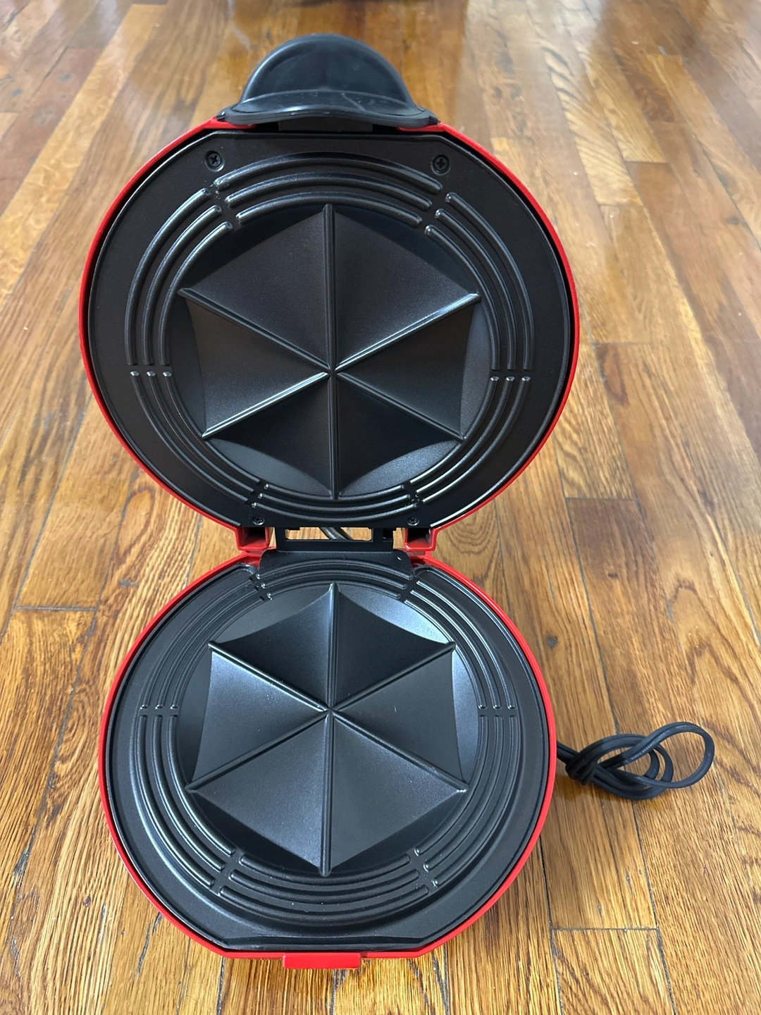 Red and black quesadilla maker with a non-stick surface. Only available for pickup