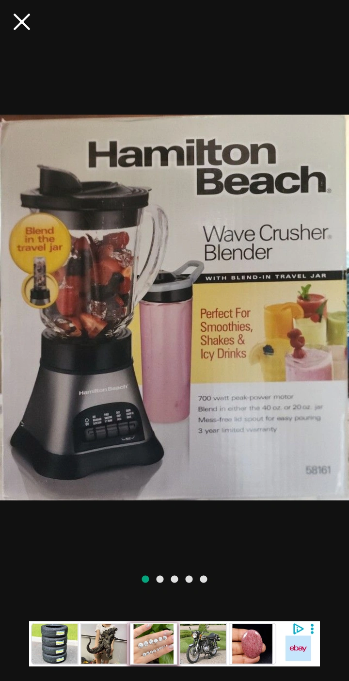 Selling a Hamilton Beach Wave Crusher Blender! It comes with a blend-in travel jar. This blender is perfect for making smoothies, shakes, and icy drinks. It has a 700 watt peak-power motor and a mess-free lid spout for easy pouring.