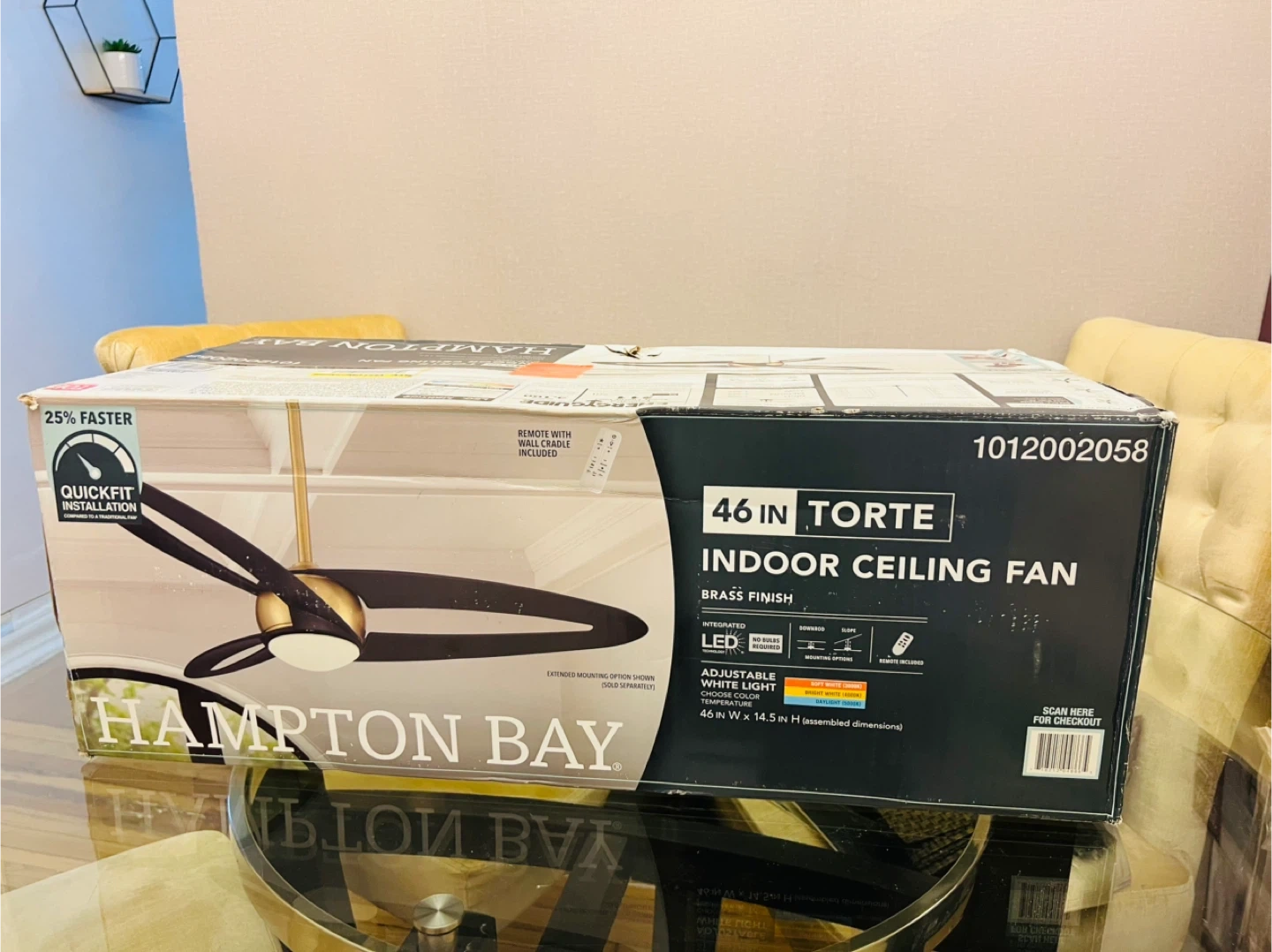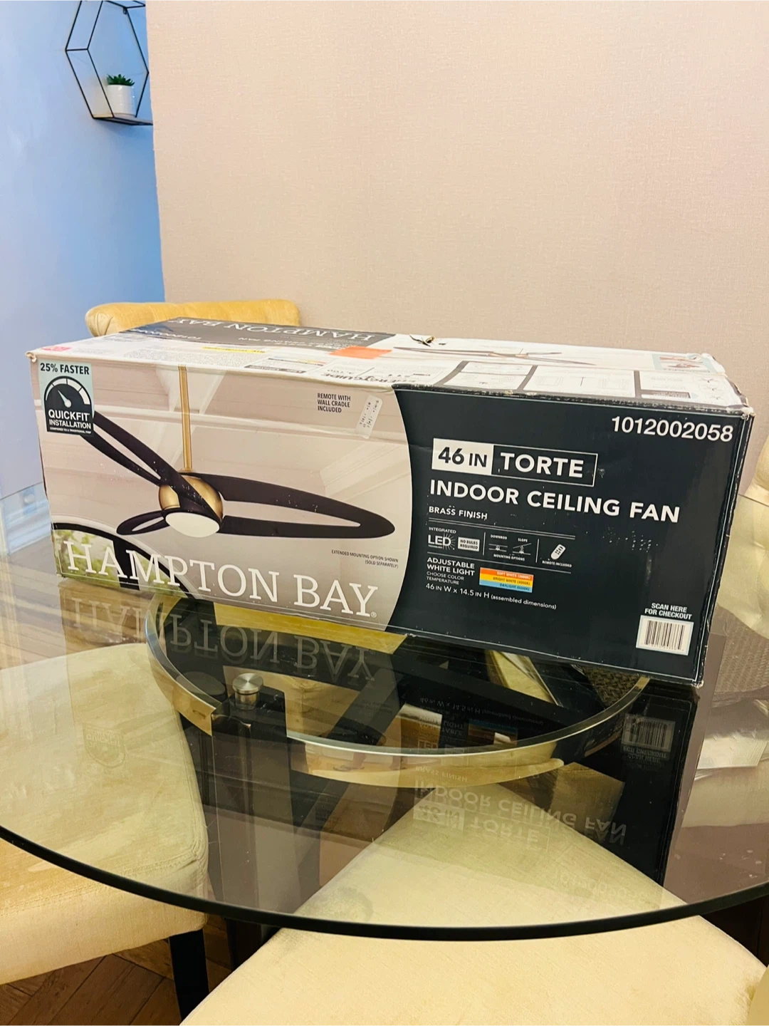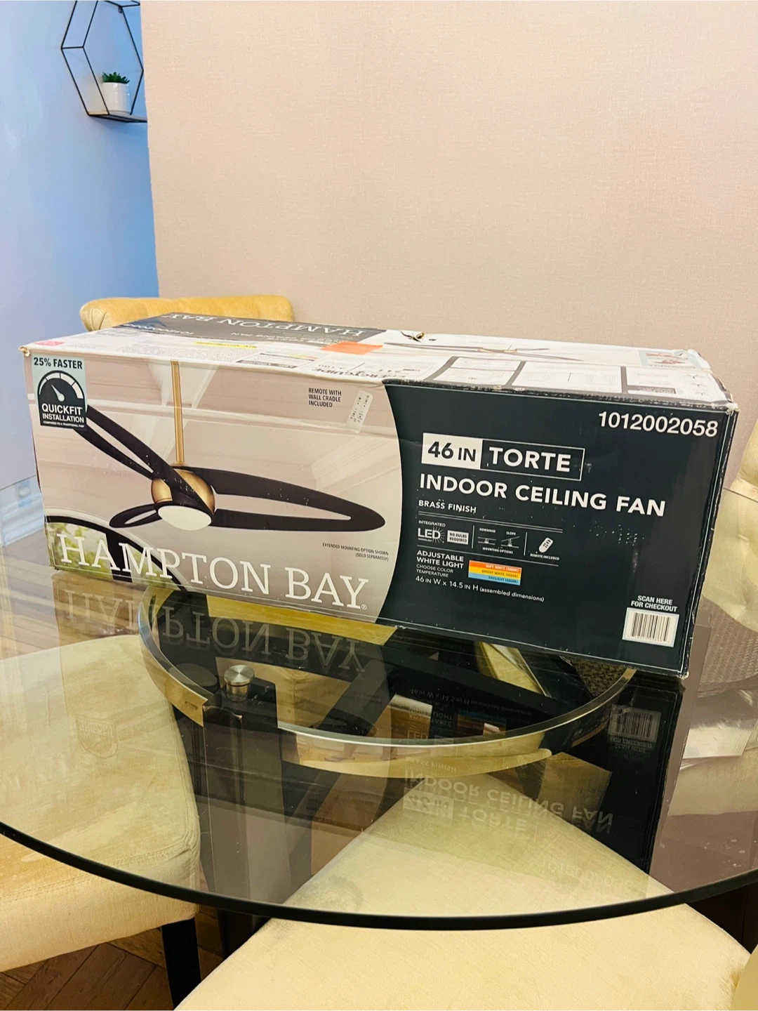 Selling a Hampton Bay 46 inch Torte indoor ceiling fan. It features a brass finish and adjustable white light. The assembled dimensions are 46 in wide x 14.5 in high. Remote with wall cradle included