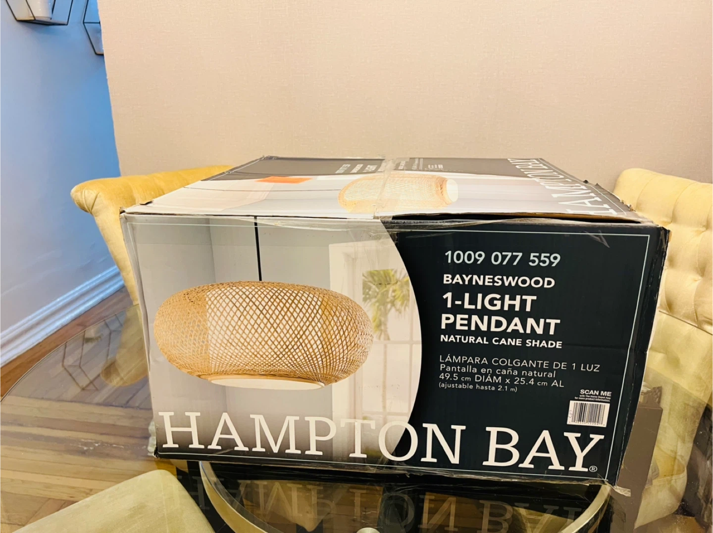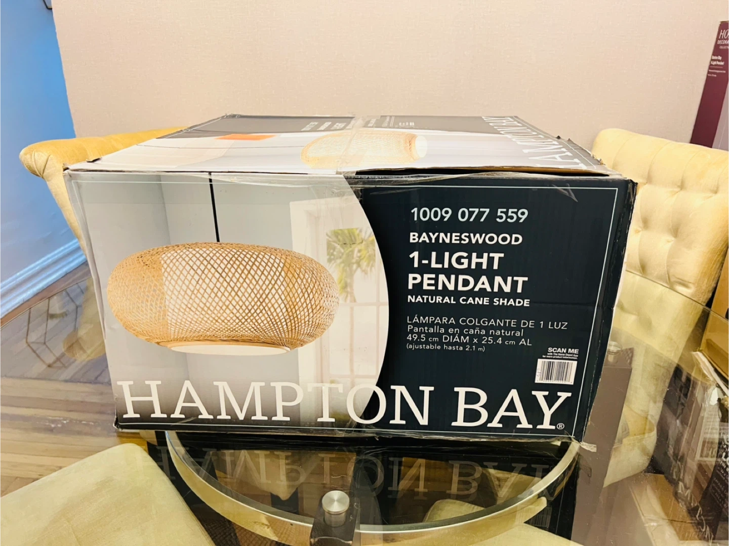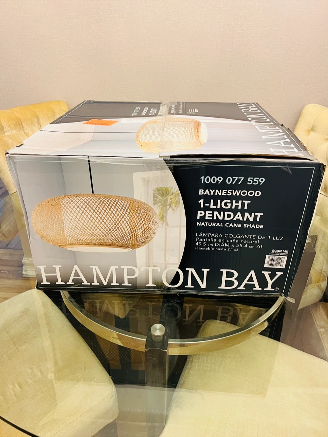 Selling a Hampton Bay Bayneswood 1-Light Pendant with a natural cane shade. It's still in its original box! The shade has a natural color and measures 19.5 inches in diameter and 10 inches in height.