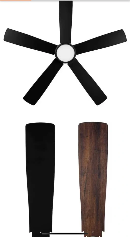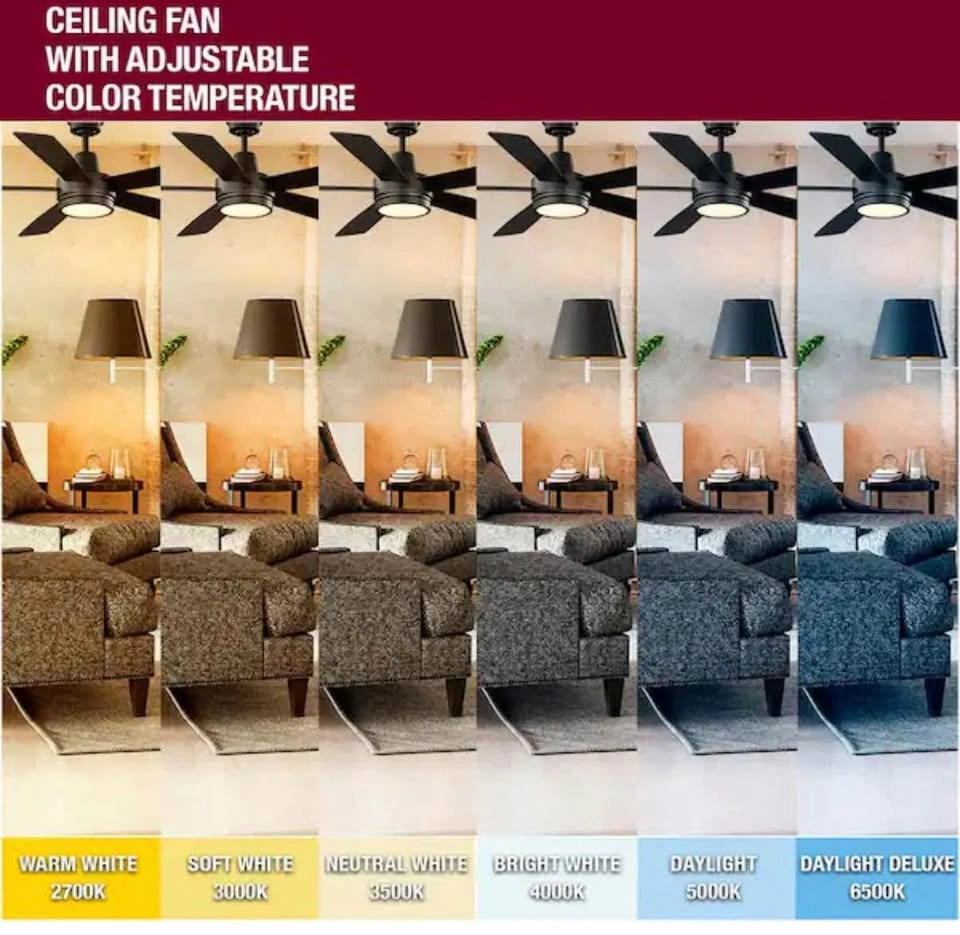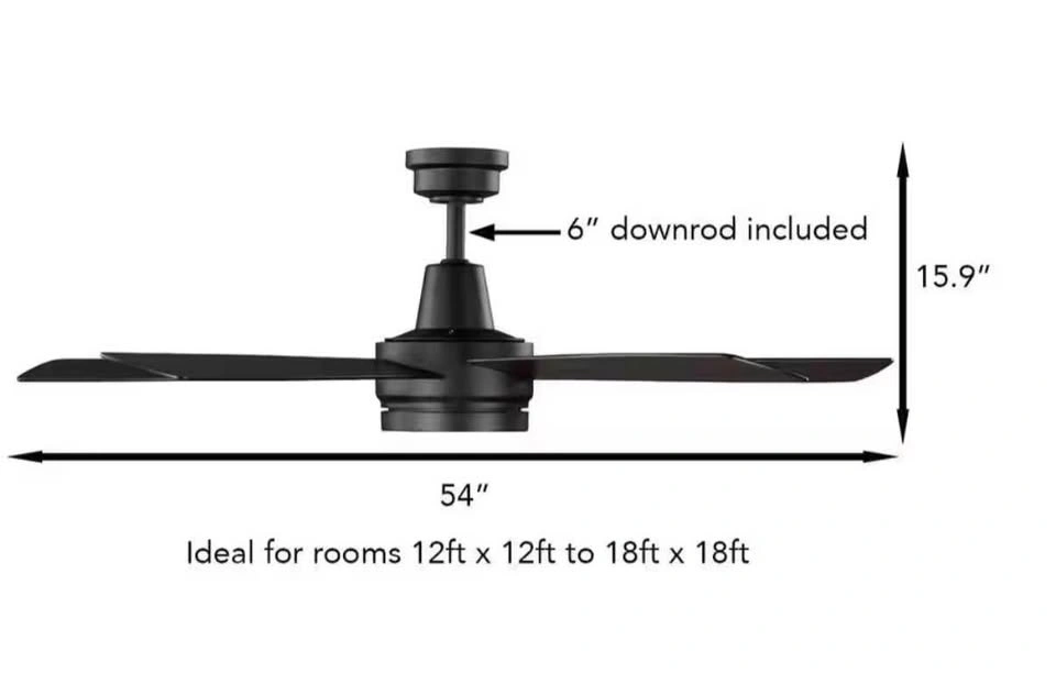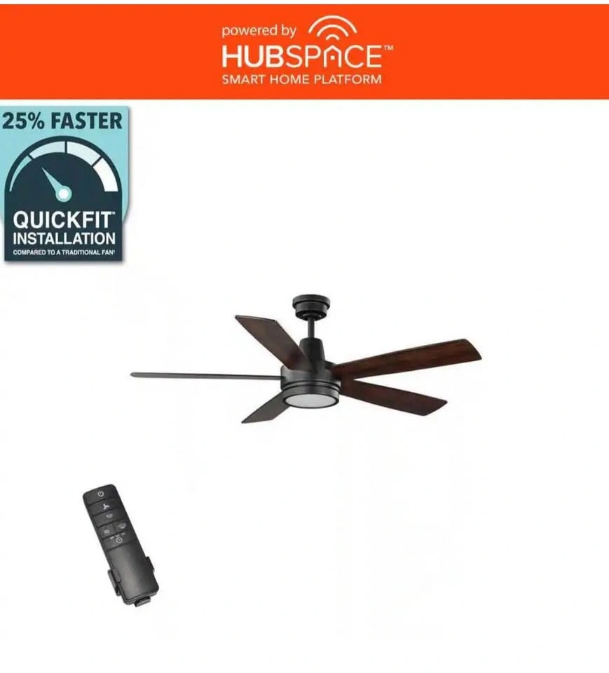 Opened box. The 54 in. Fanelee Smart Ceiling Fan from Hampton Bay is the perfect way to add a ceiling fan to your smart home ecosystem. This fan offers a variety of control options: remote control (included), control via your smart device (phone or tablet) with the Hubspace App or voice control with Alexa or Google Assistant. The integrated 31-Watt LED offers ample lighting and the ability to choose from 6-different light temperature settings ranging from 2700K to 6500K. The stark matte black finish is complemented with a frosted shatter resistant plastic shade that mimics frosted glass with the added benefit of not breaking if dropped during cleaning. Designed for indoor use in large rooms, the Fanelee features a quiet, yet powerful, 4-speed reversible motor for year-round comfort.