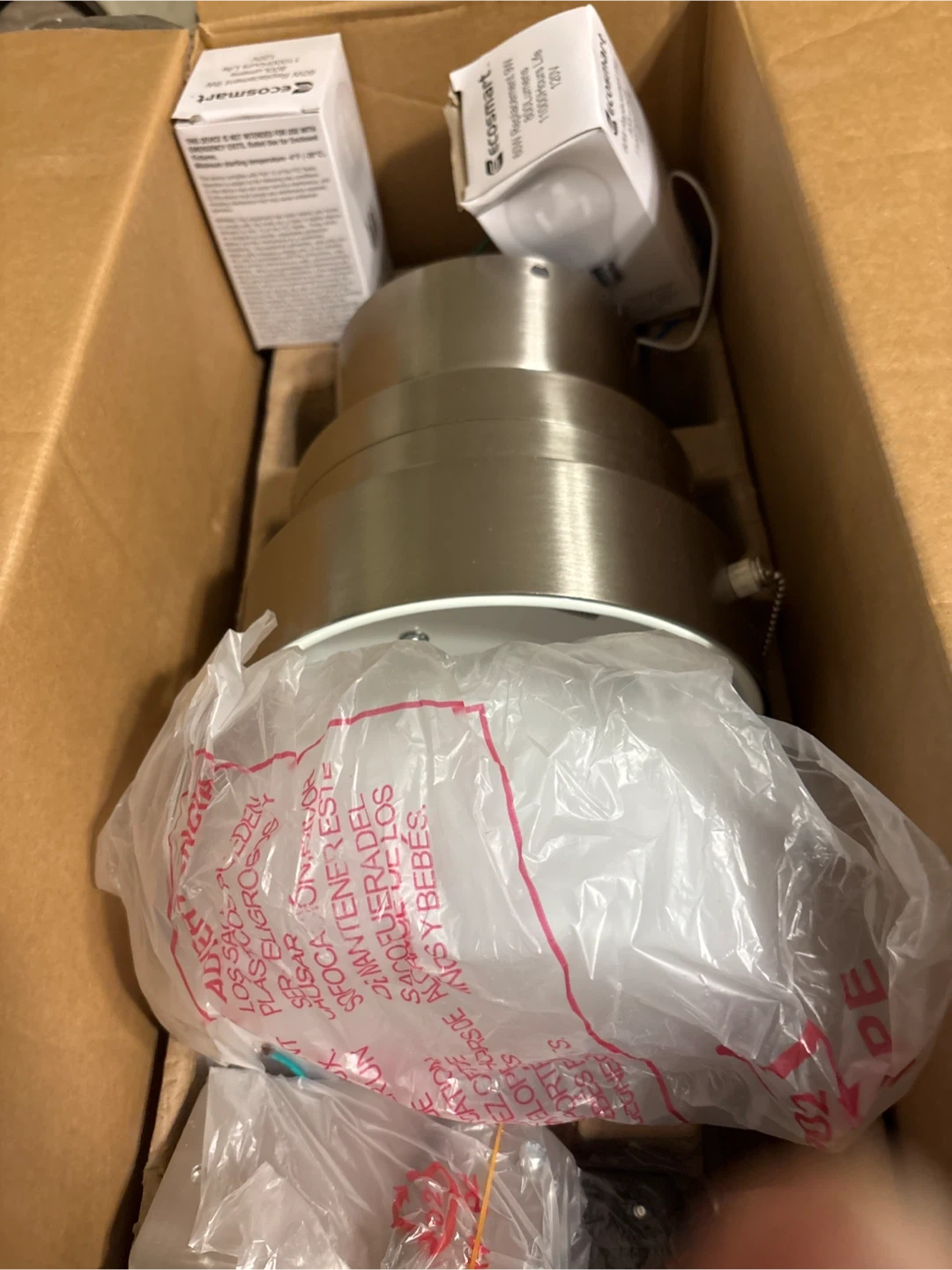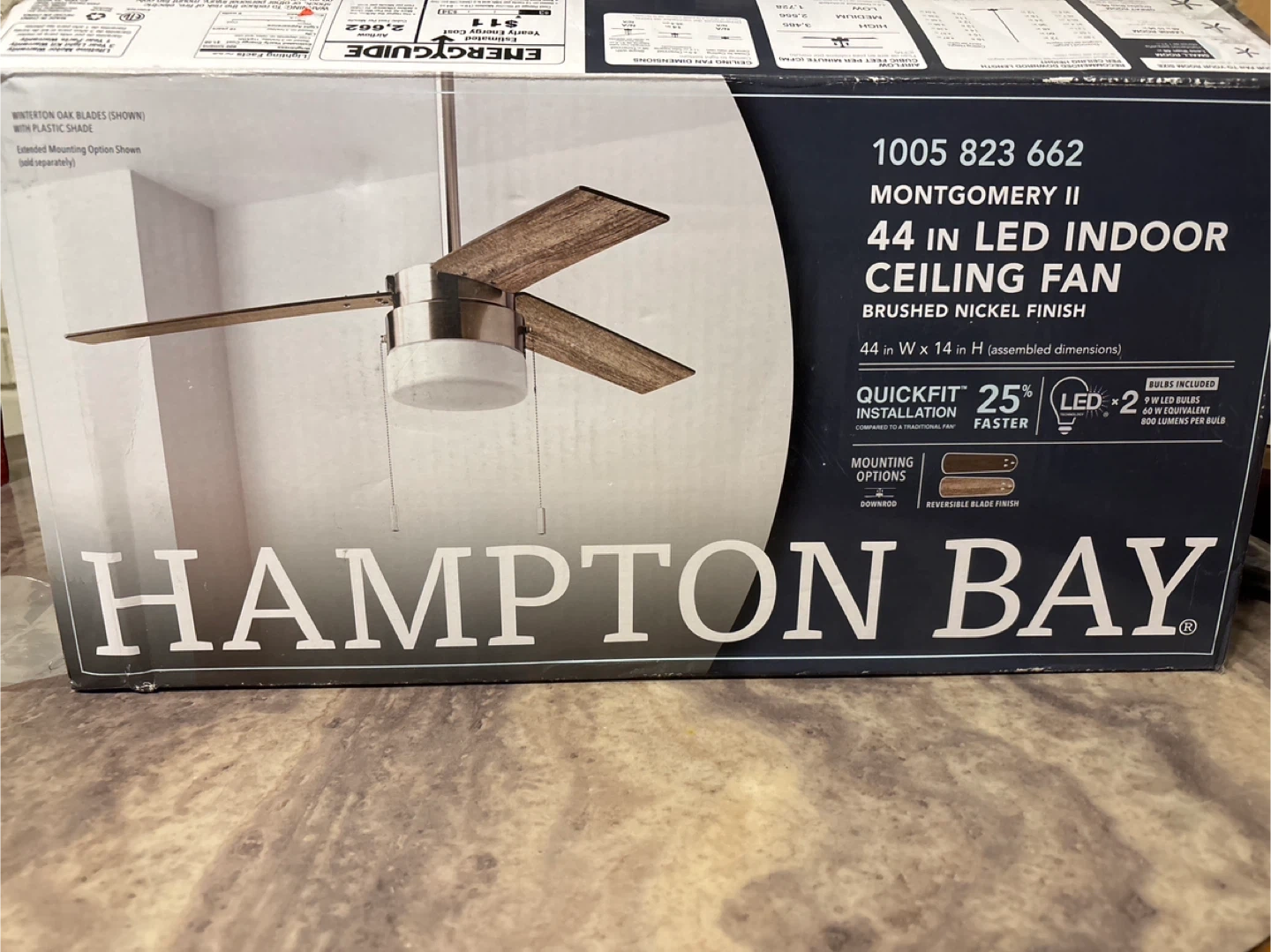 Selling a brand new Hampton Bay Montgomery II 44-inch indoor ceiling fan in brushed nickel finish! It features: - 44 in W x 14 in H (assembled dimensions) - QuickFit 25% faster installation compared to a traditional fan - Includes two 9-watt LED bulbs, each producing 800 lumens