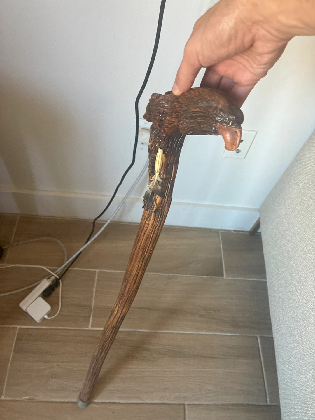 Here is a hand carved wooden walking stick. The handle is carved into the shape of an eagle's head. It appears to be in good condition.