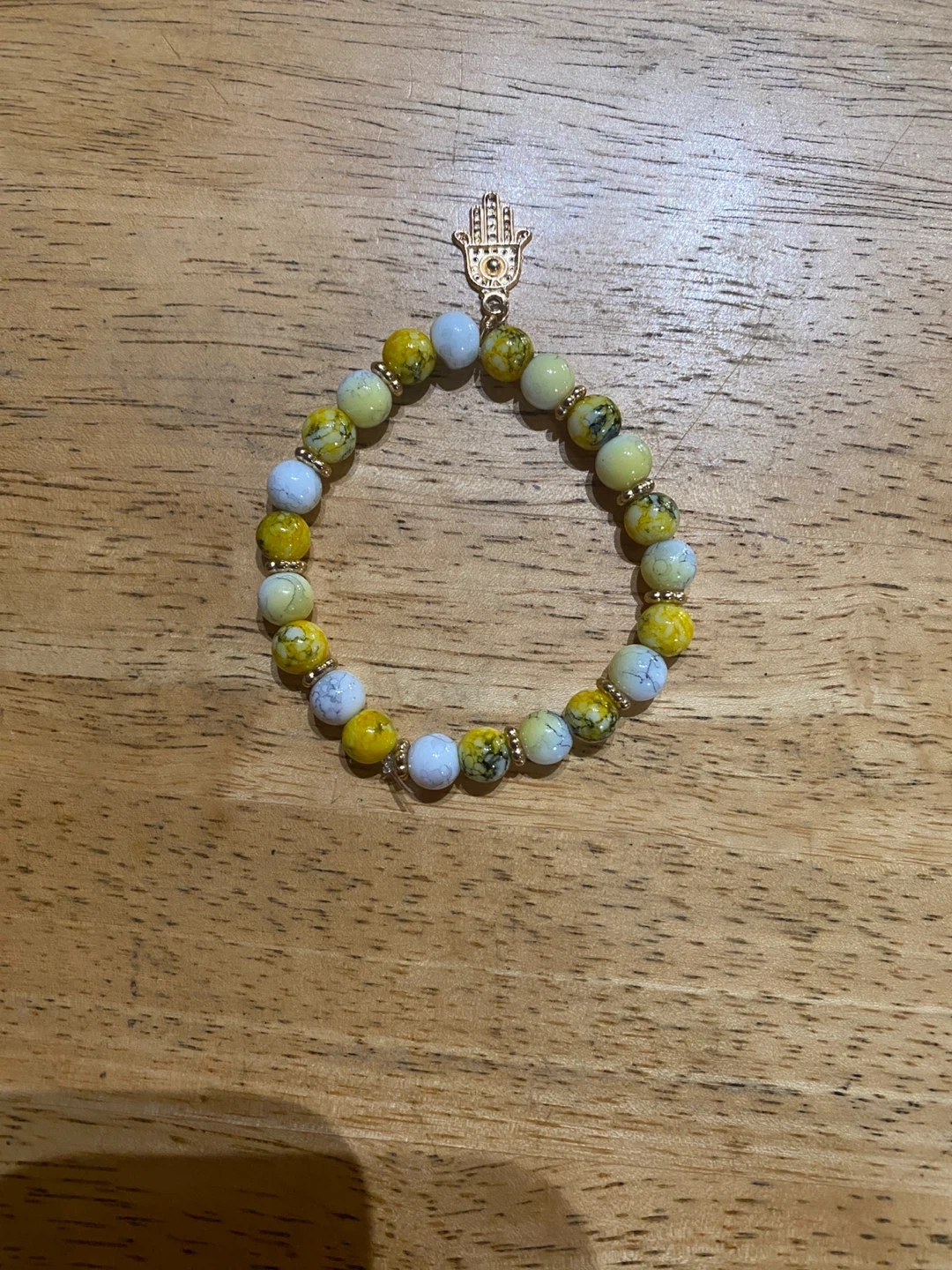 75Here's a cute beaded bracelet with a hand charm! It features yellow, white, and gold beads