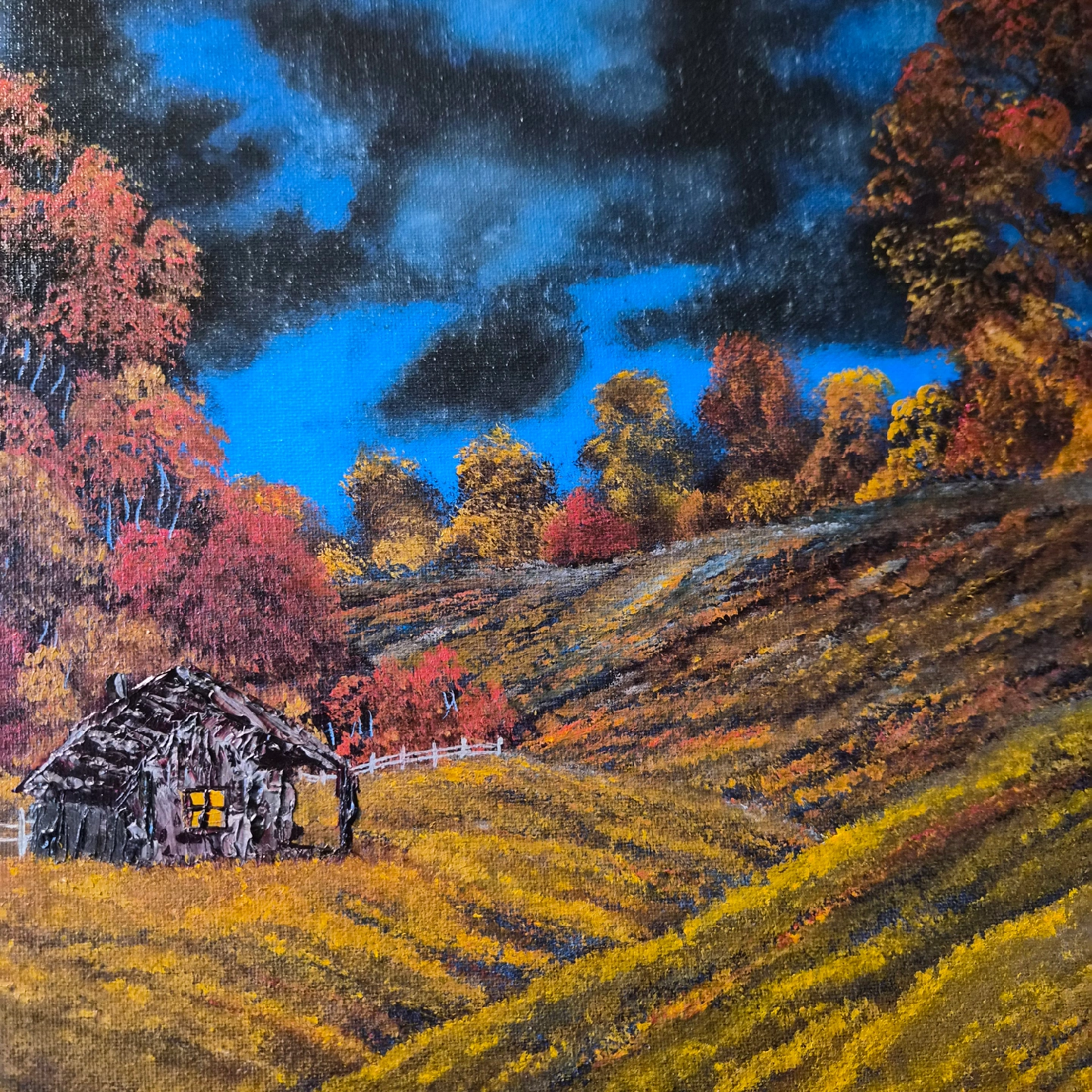 Impressionistic Autumn Landscape Dynamic Luminous Fierce Rustic Cabin Stormy Sky Vivid Nostalgia Phthalo Blue Bright Red Cadmium Yellow Yellow Ochre Indian Yellow Sap Green Van Dyck Brown Lamp Black Titanium White Hand Mixed Colors 12x16in
