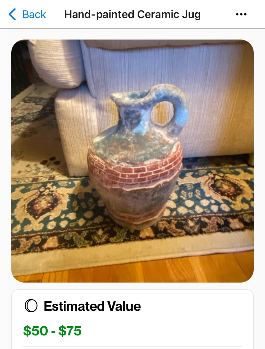 Selling a hand-painted ceramic jug. It has a unique design with a brick-like pattern around the middle. The estimated value is between $50 and $75