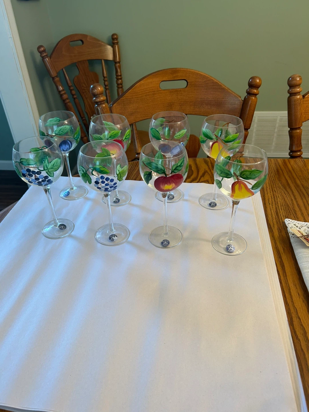 I have a set of 8 hand-painted wine glasses for sale! Each glass features a different fruit design, including blueberries, apples, and pears. They are in great condition and ready to add a touch of whimsy to your next gathering