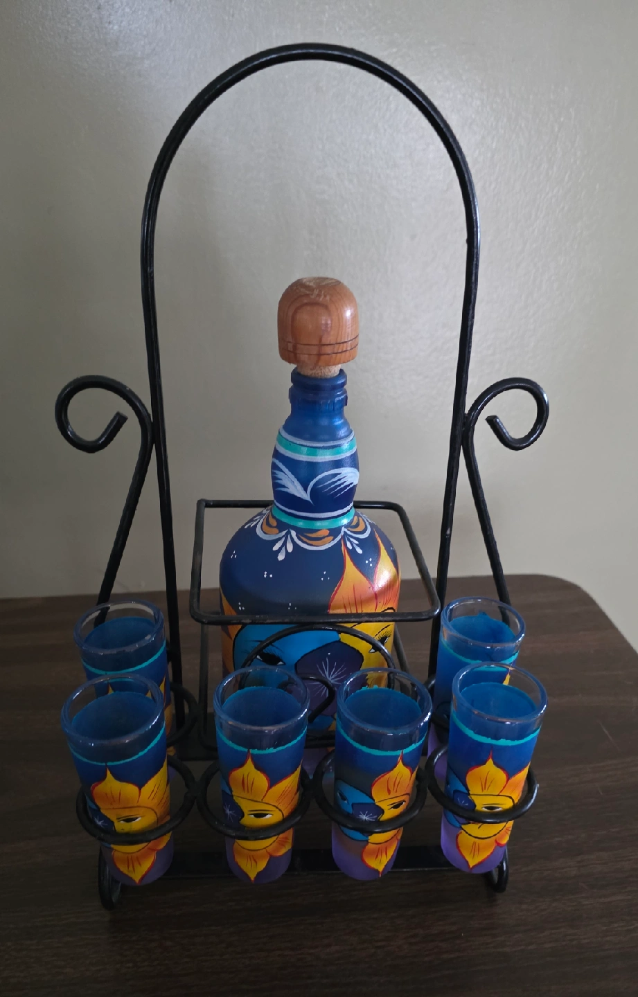 Selling a hand painted tequila set! It includes a bottle and six shot glasses with a sun and moon design. The set comes with a metal stand for display and storage. Perfect for adding a touch of artistry to your home bar or for entertaining guests