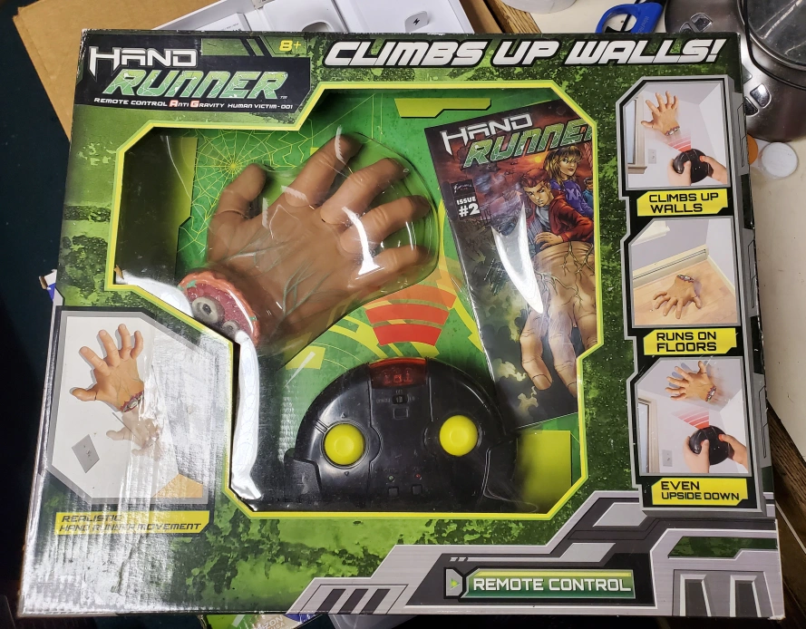 Selling a Hand Runner remote control toy! It climbs up walls, runs on floors, and even works upside down. It's anti-gravity and comes with a comic book!