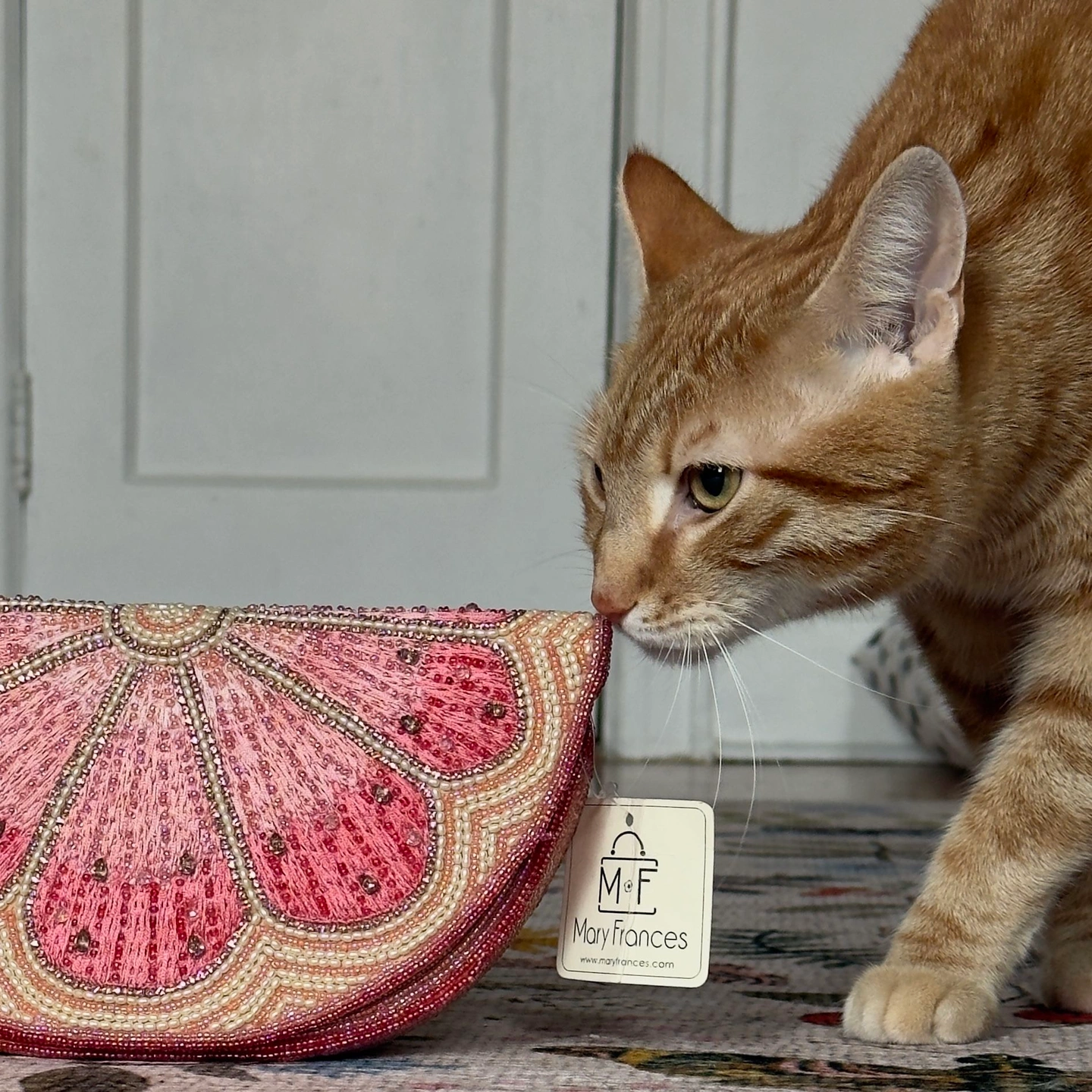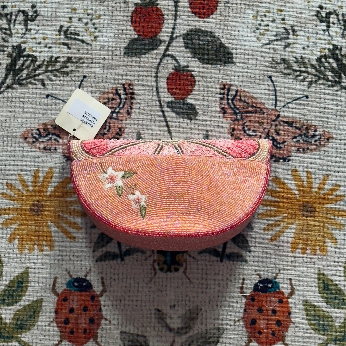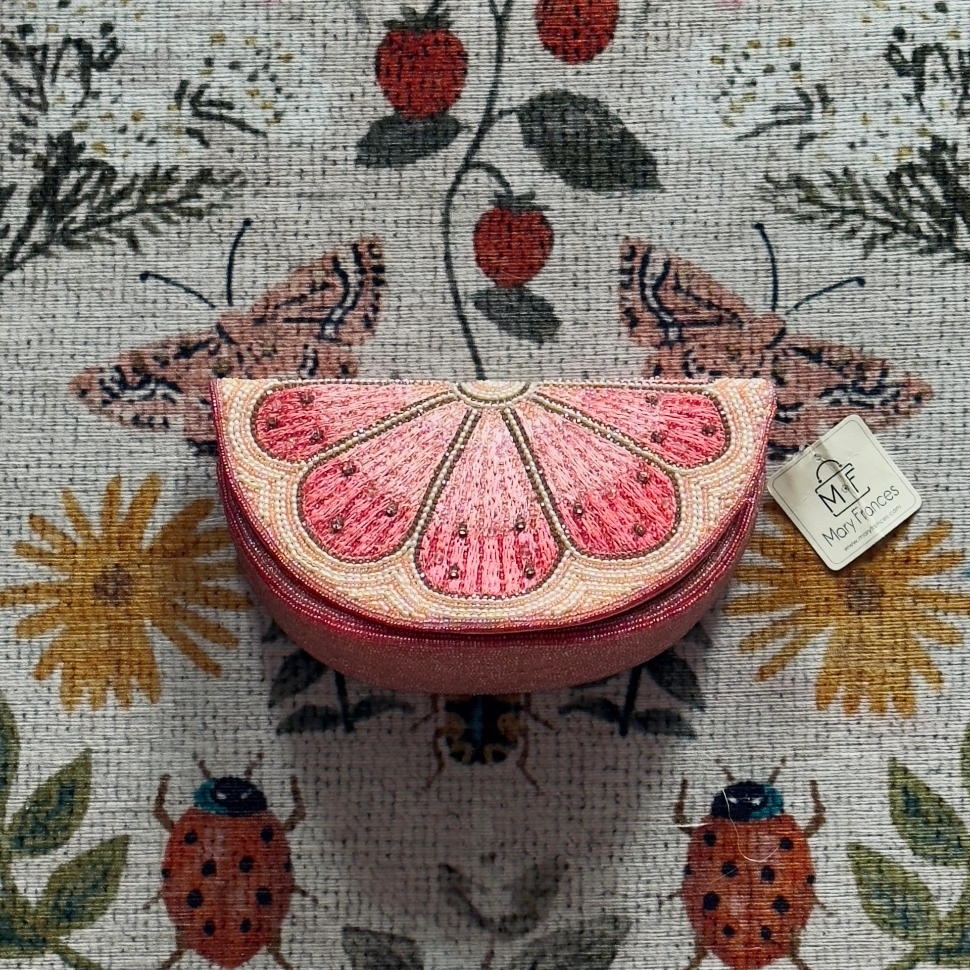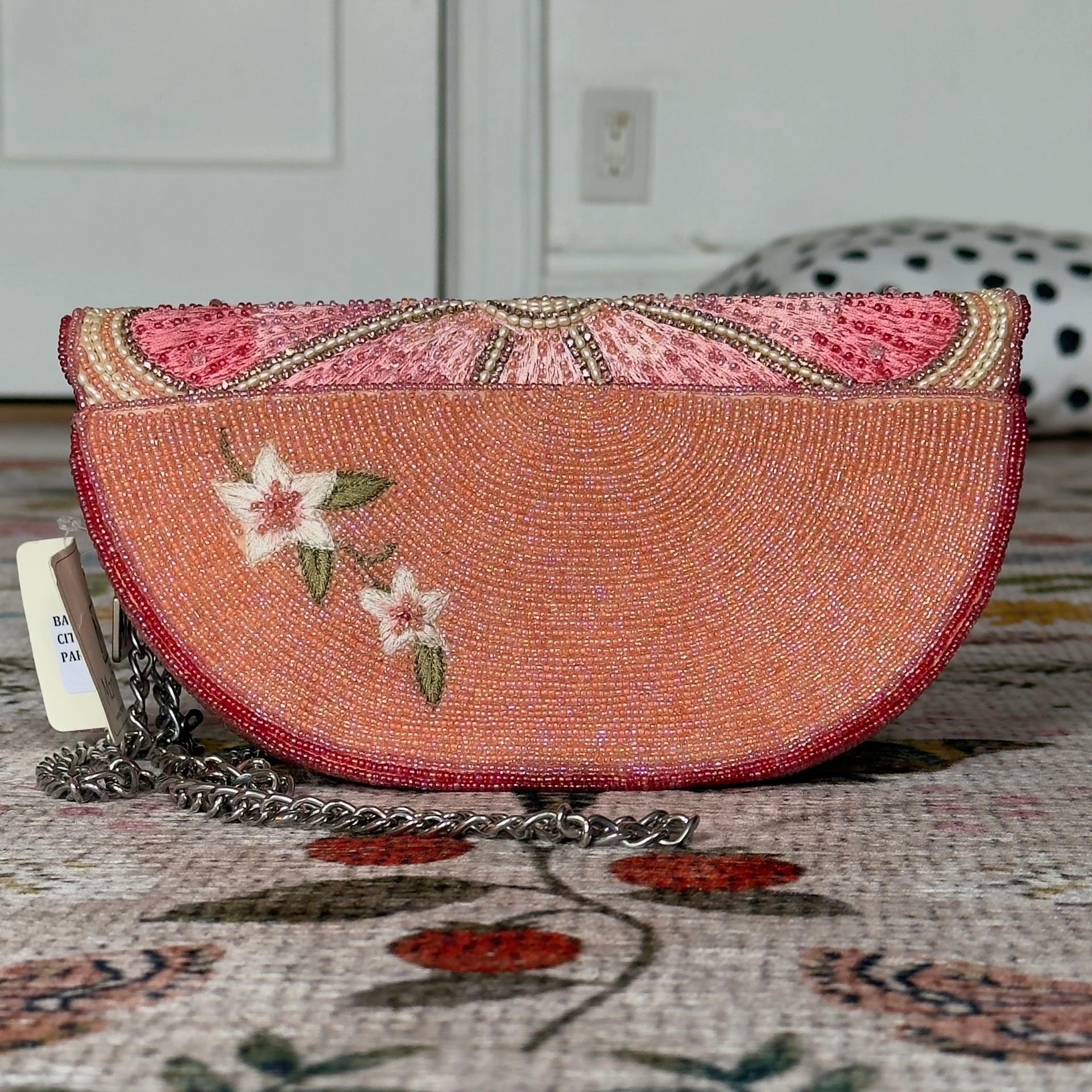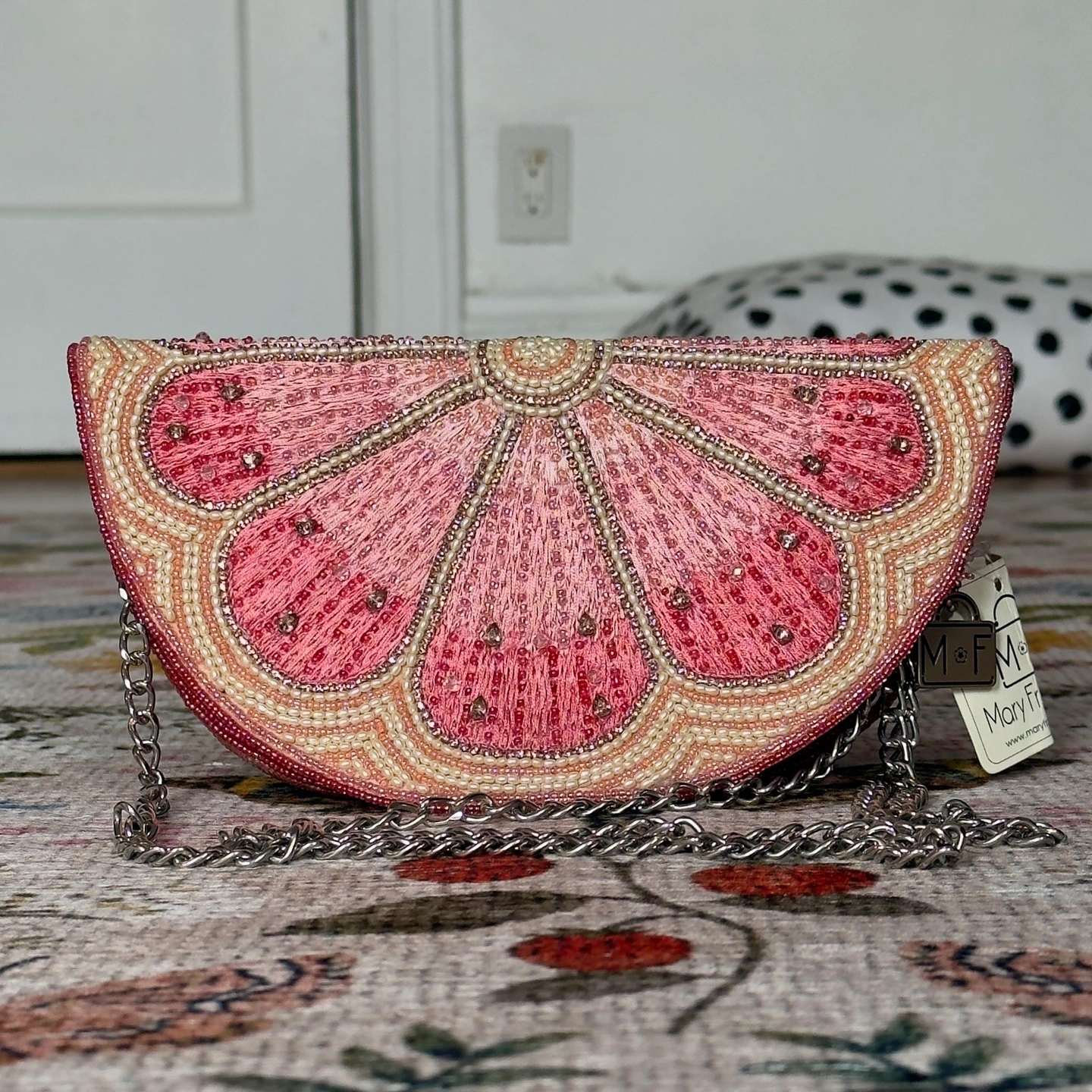 15A Citrus In Paradise Crossbody Handbag by Mary Frances! A lovely pink grapefruit that is completely covered in intricate beadwork, embroidery and rhinestone "seeds". The strap is a removeable silvertone chain so you may use it as a clutch. Perfect for summer or fruit themed outfits! It has a back slip pocket, inside pocket, fabric lining, magnet closure and it will fit a cellphone. A certificate of authenticity and a Mary Frances dust bag are included. Approximate Measurements: 9.25 x 4.25 x 5 inches Strap = 22.5 inch strap drop, overall length is 49 inches. Each Mary Frances design is a hand crafted work of art so you should expect slight differences between pieces. You should store your Mary Frances accessory in the included protective dust cover when not in use. All Mary Frances products are created by certified socially compliant partnerships. Features: Detachable strap, Cross-body strap, Outer pockets, Inner pockets, Lightweight Color: Pink Material: bead embroidery on fabric Style: Bucket & Drawstring bags Brand: Mary Frances