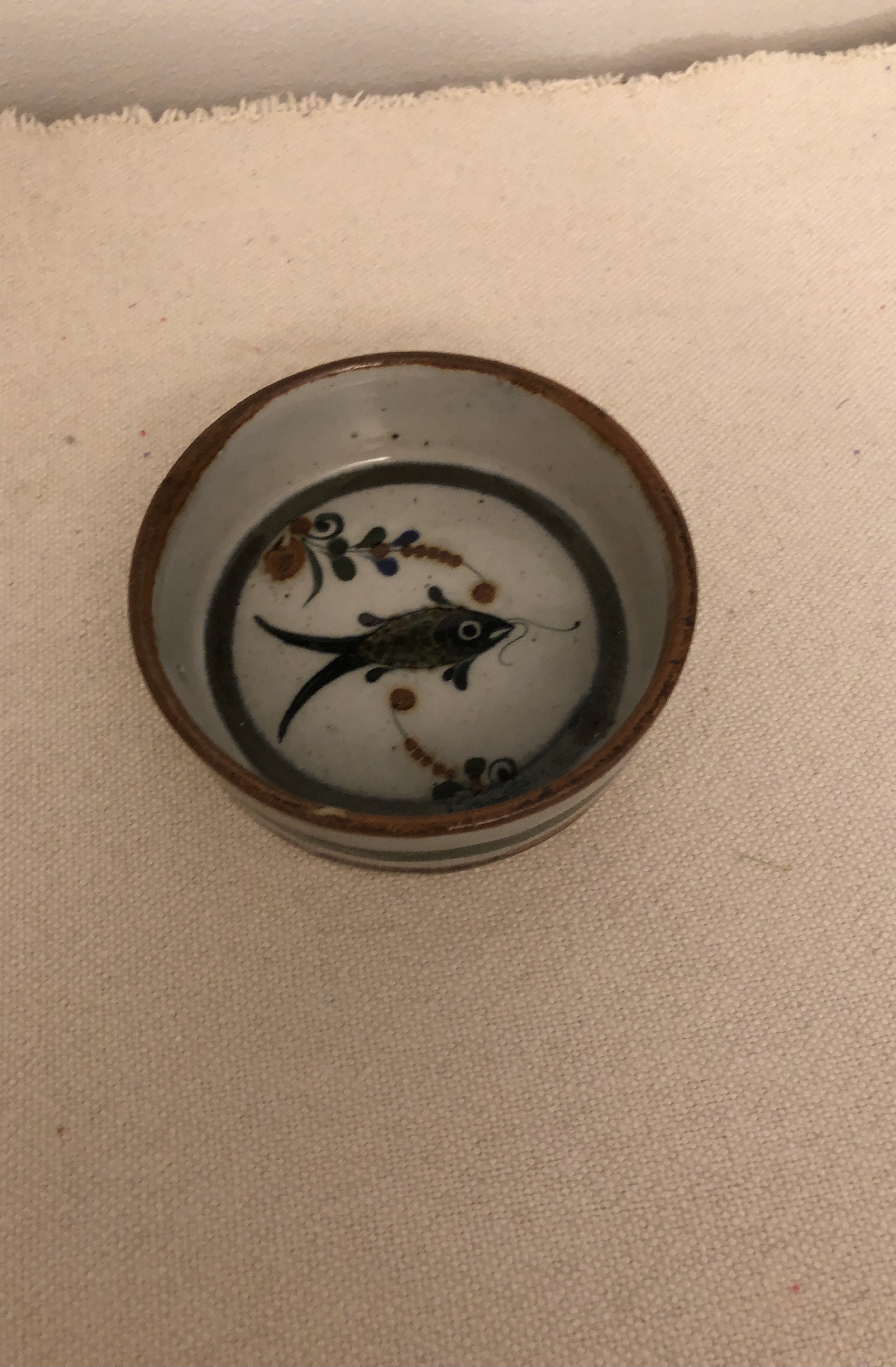 This is a lovely handcrafted ceramic bowl featuring a unique fish design. It's perfect for adding a touch of artistic charm to your home! The bowl has a brown rim and a light gray interior with a stylized fish illustration and floral accents.