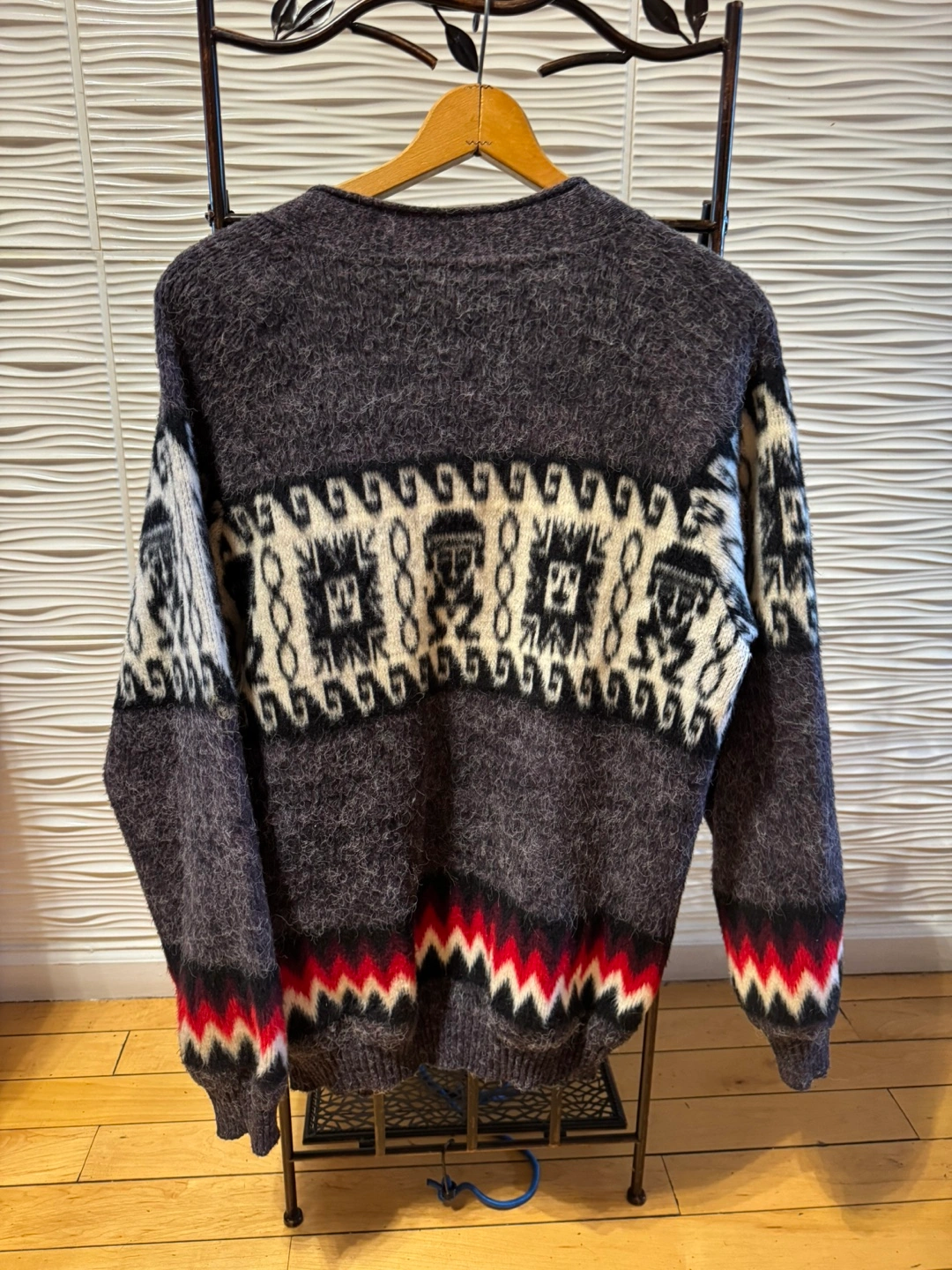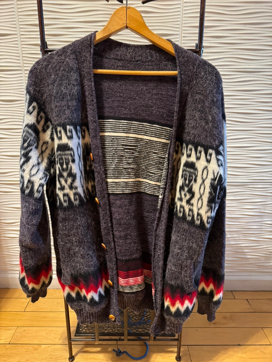 This is a cozy, handmade alpaca wool cardigan. It features a unique pattern with black, white, and red accents. The cardigan is in great condition and perfect for adding a touch of warmth and style to your wardrobe