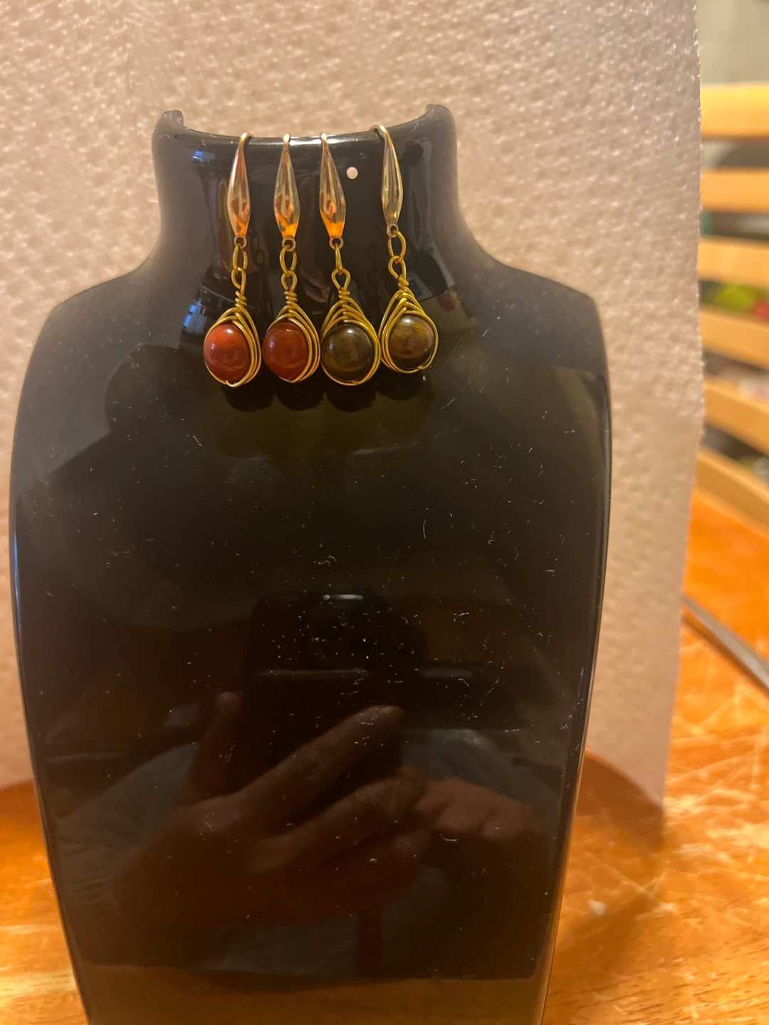 Three pairs of handmade earrings. Gold wire wrapped red and brown stone beads. Dangle style earrings.