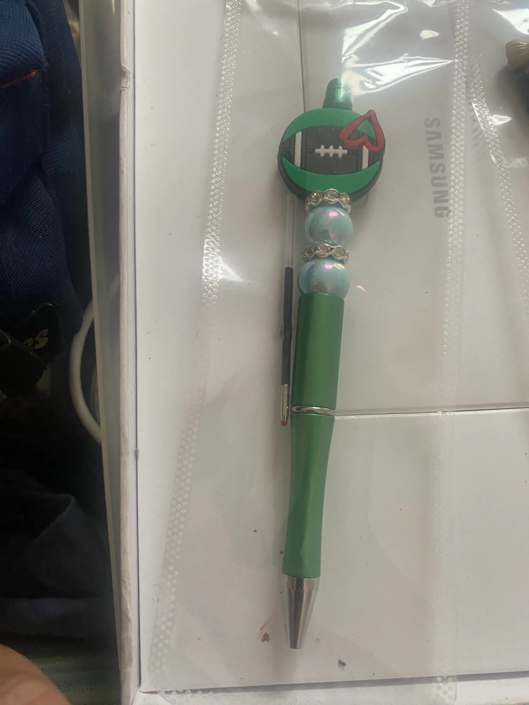 75Check out this cute handmade beaded pen! It features a football charm and green barrel, perfect for adding a little personality to your writing. It's in great condition and ready for a new home