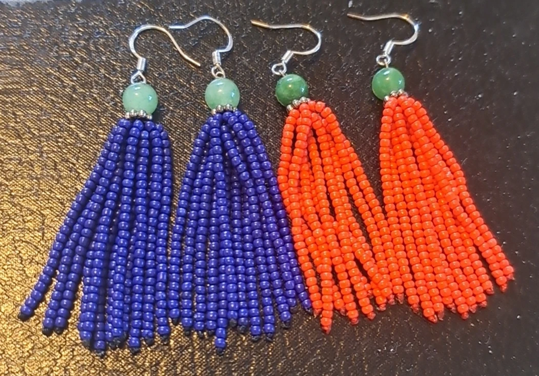 25Here are some handmade beaded tassel earrings! They come in two colors: blue and orange. These earrings are perfect for adding a pop of color to any outfit