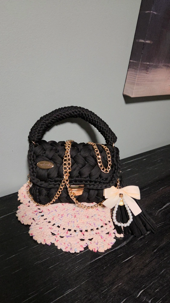 This is a cute handmade black braided handbag with gold chain detailing and a decorative bow and pearl accent. It's in great condition and ready for a new home!