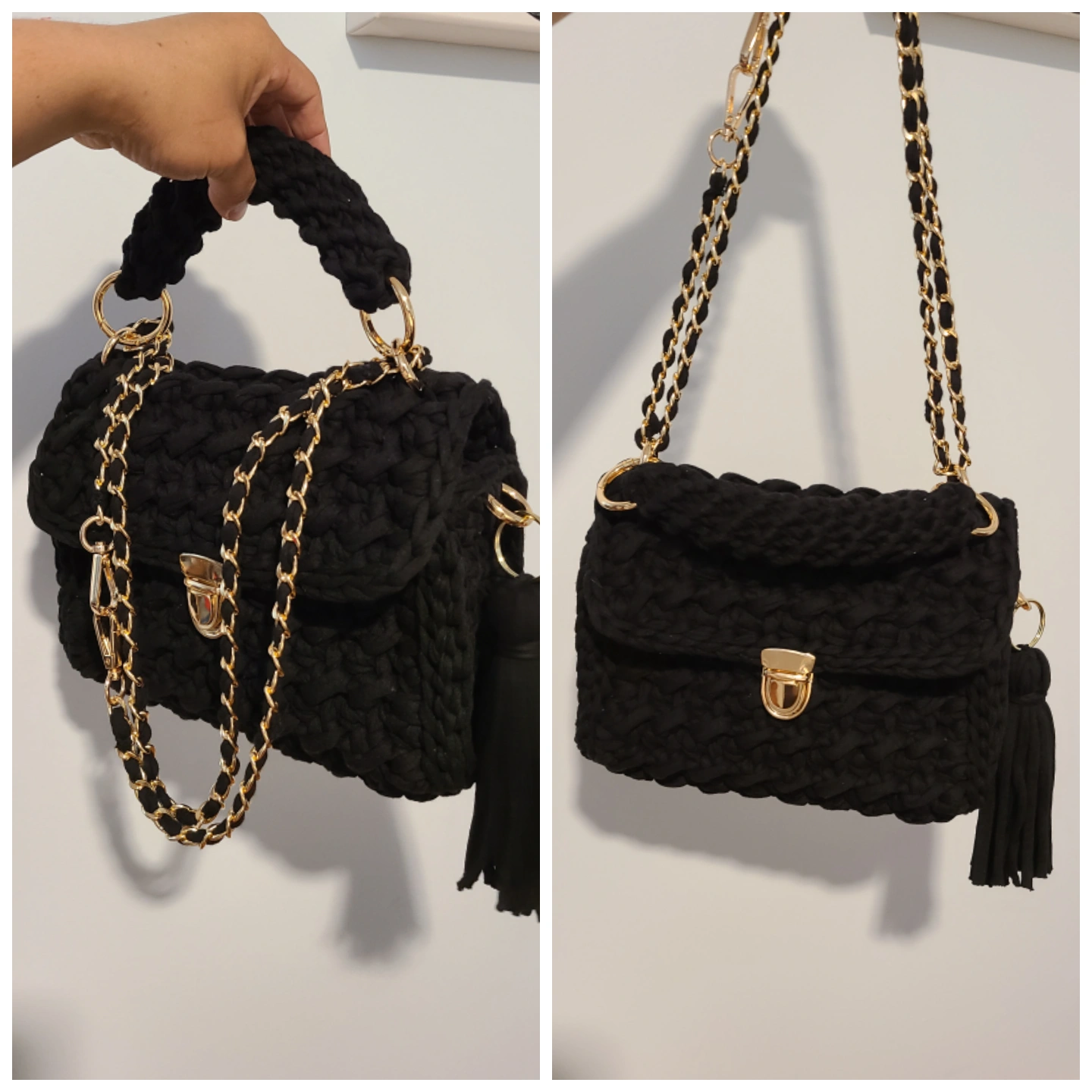10Selling a beautiful handmade black crochet bag. It features a stylish gold chain and a unique tassel detail. Perfect for adding a touch of elegance to any outfit!