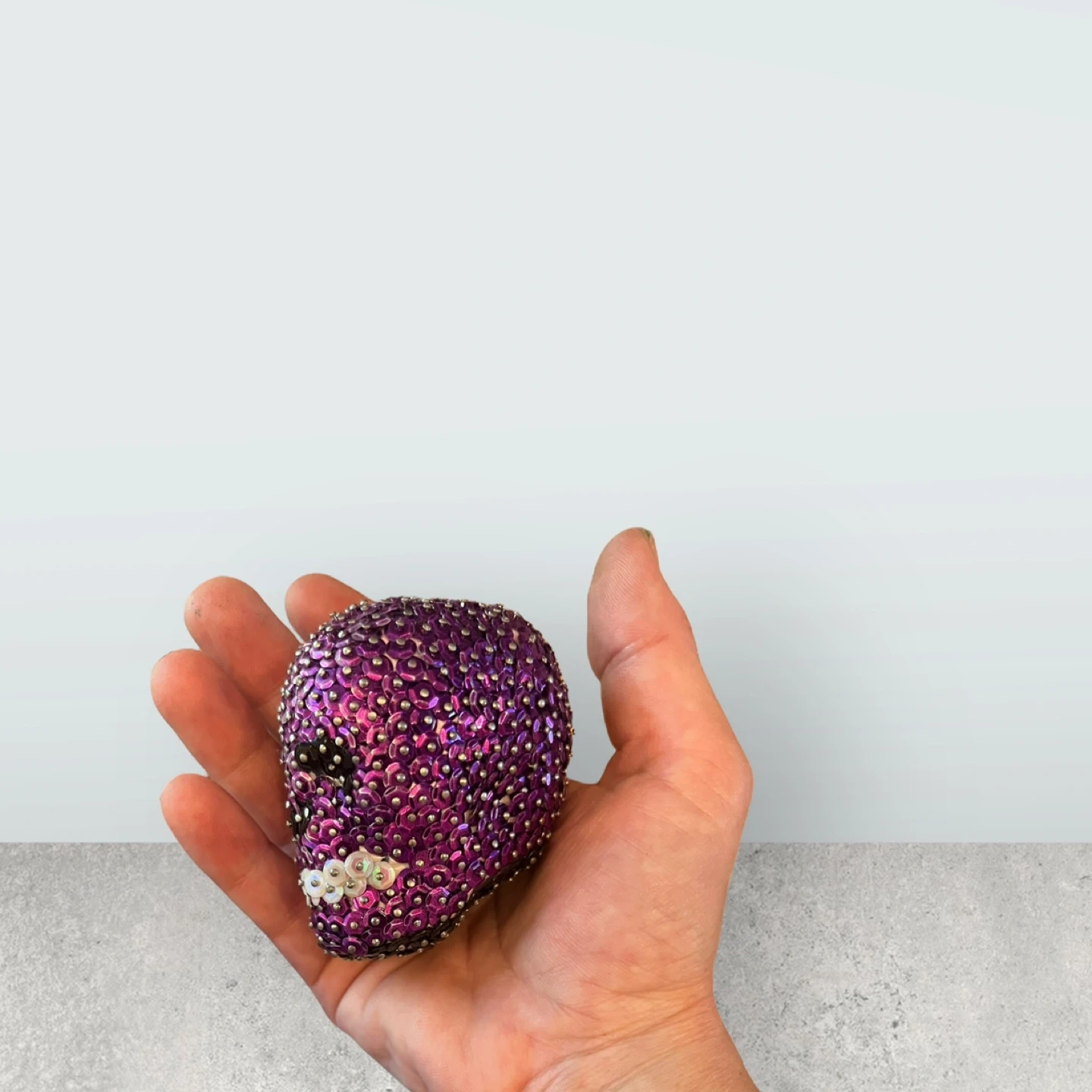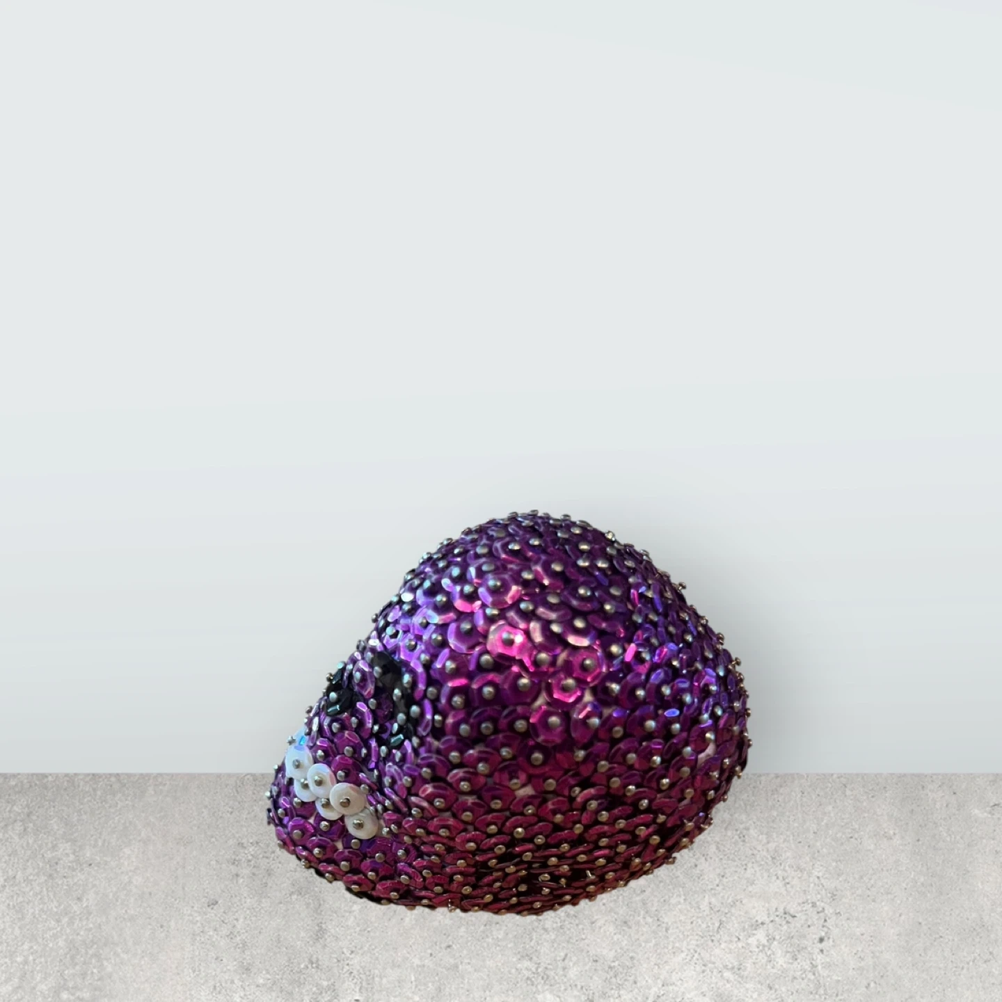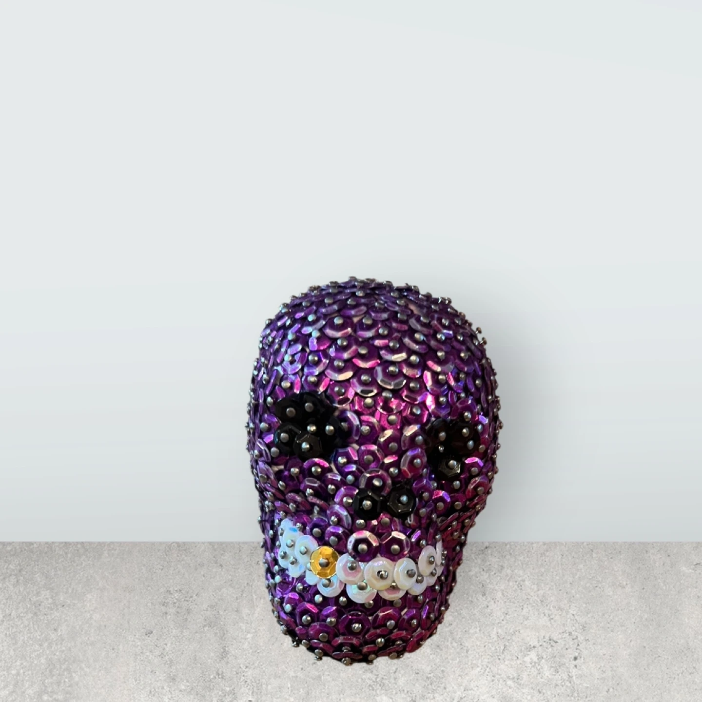 The product is a handmade sequin skull, adorned with intricate designs and patterns. This unique and eye-catching piece is perfect for collectors of fantasy, mythical, and magic-themed items. The skull motif adds a touch of edgy and mysterious flair to any collection, making it a standout piece for those who appreciate the macabre and the mystical. Great Halloween decor.