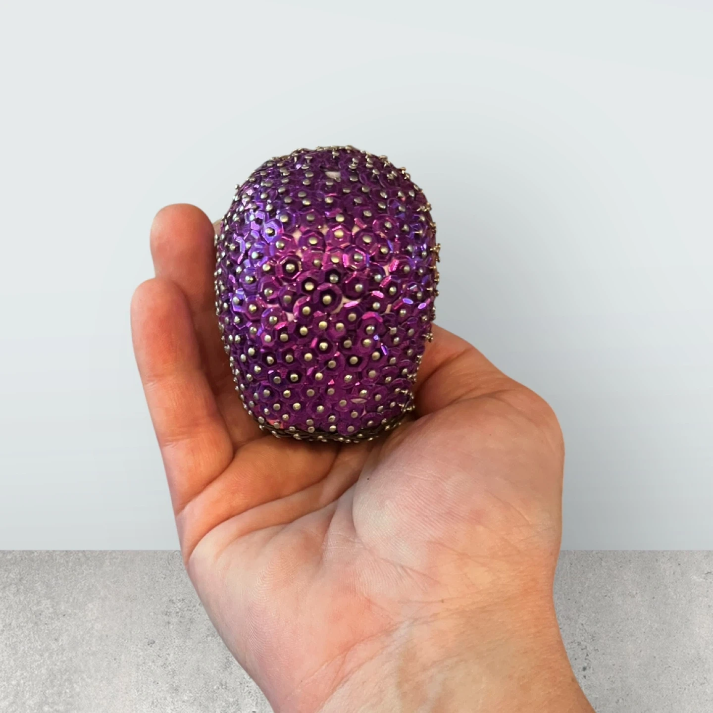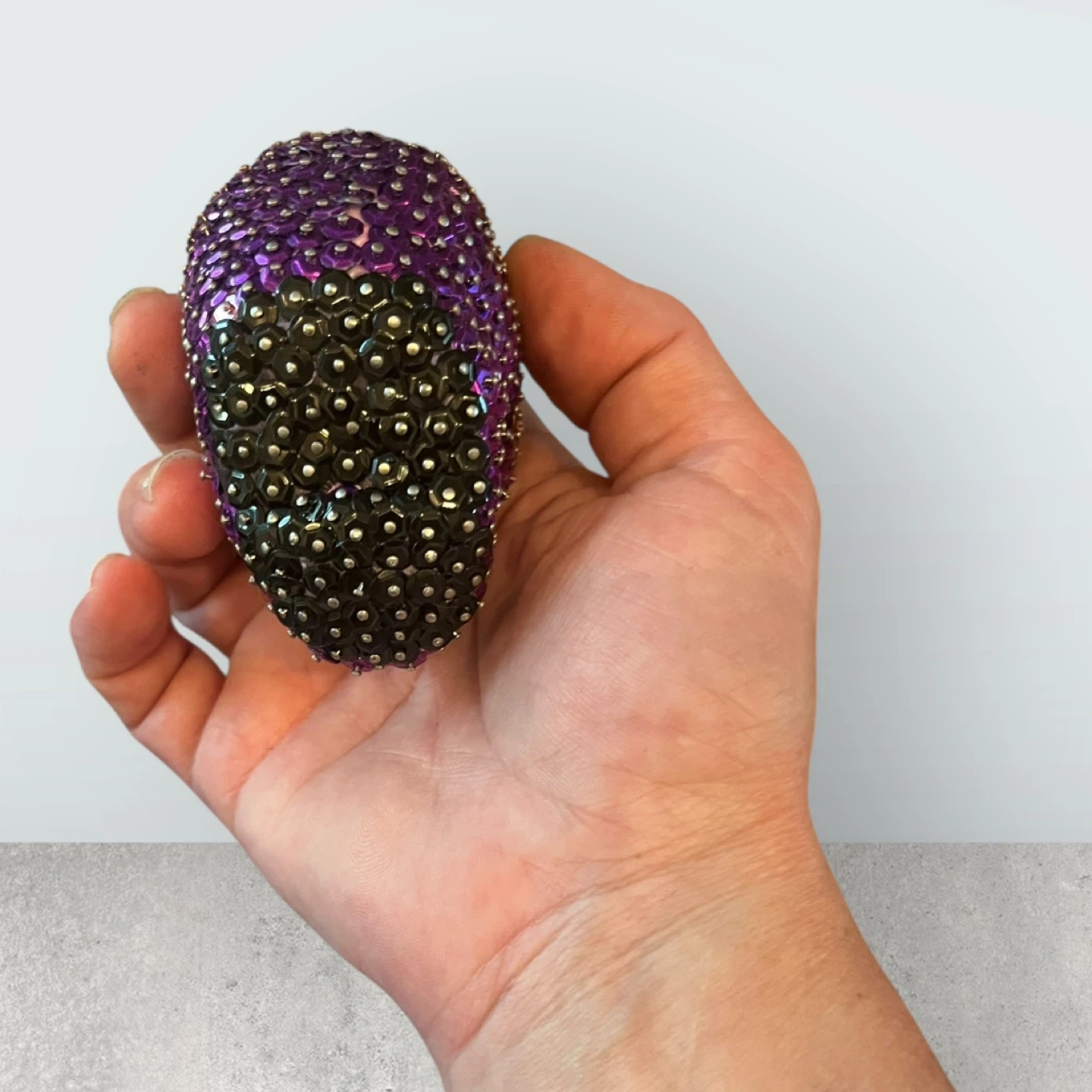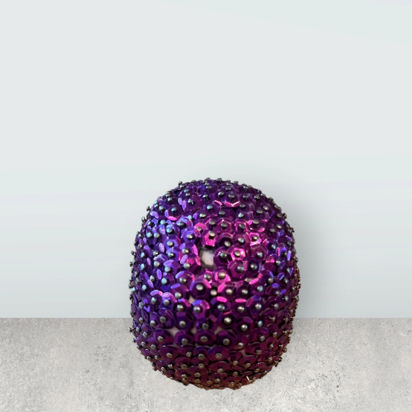 The product is a handmade sequin skull, adorned with intricate designs and patterns. This unique and eye-catching piece is perfect for collectors of fantasy, mythical, and magic-themed items. The skull motif adds a touch of edgy and mysterious flair to any collection, making it a standout piece for those who appreciate the macabre and the mystical. Great Halloween decor.