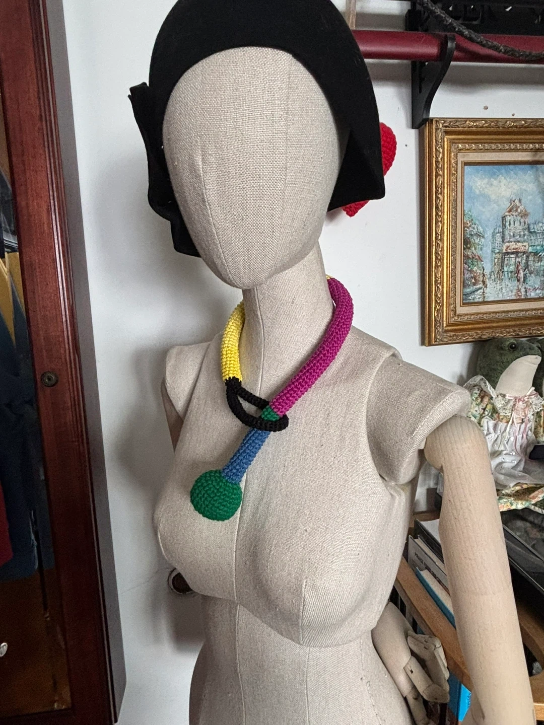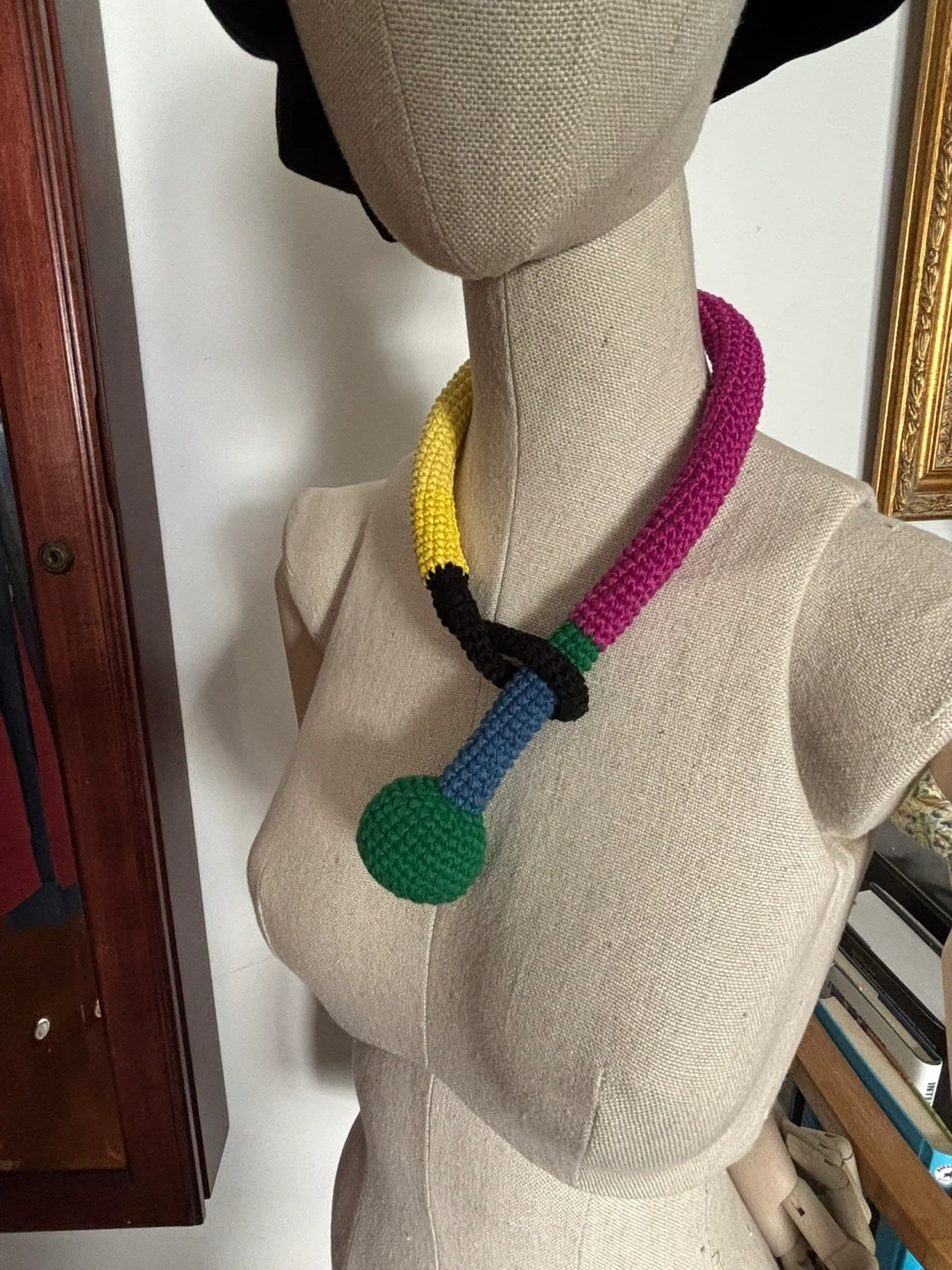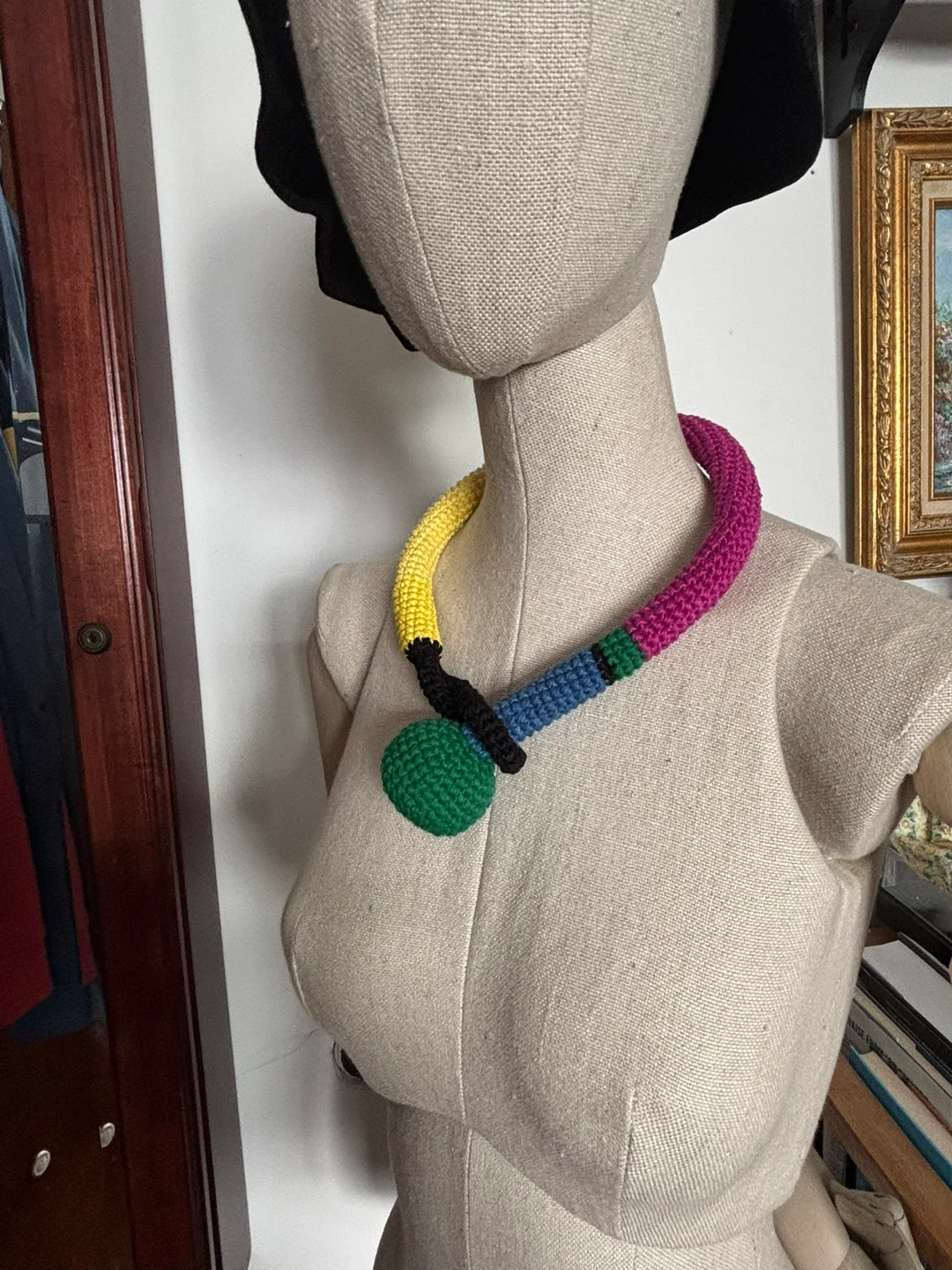 Selling a unique and eye-catching crochet necklace! It features a vibrant mix of colors including yellow, pink, green, blue, and black. This handmade piece is sure to add a fun pop of color to any outfit