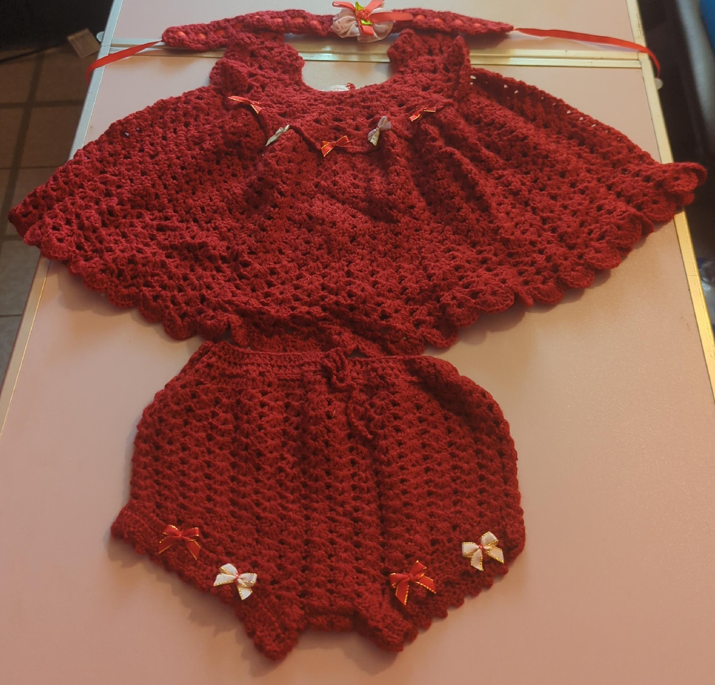 Adorable handmade crochet baby outfit! This set includes a dress, bloomers, and a headband. The outfit is red and features cute ribbon bows. Perfect for a special occasion or a photo shoot!