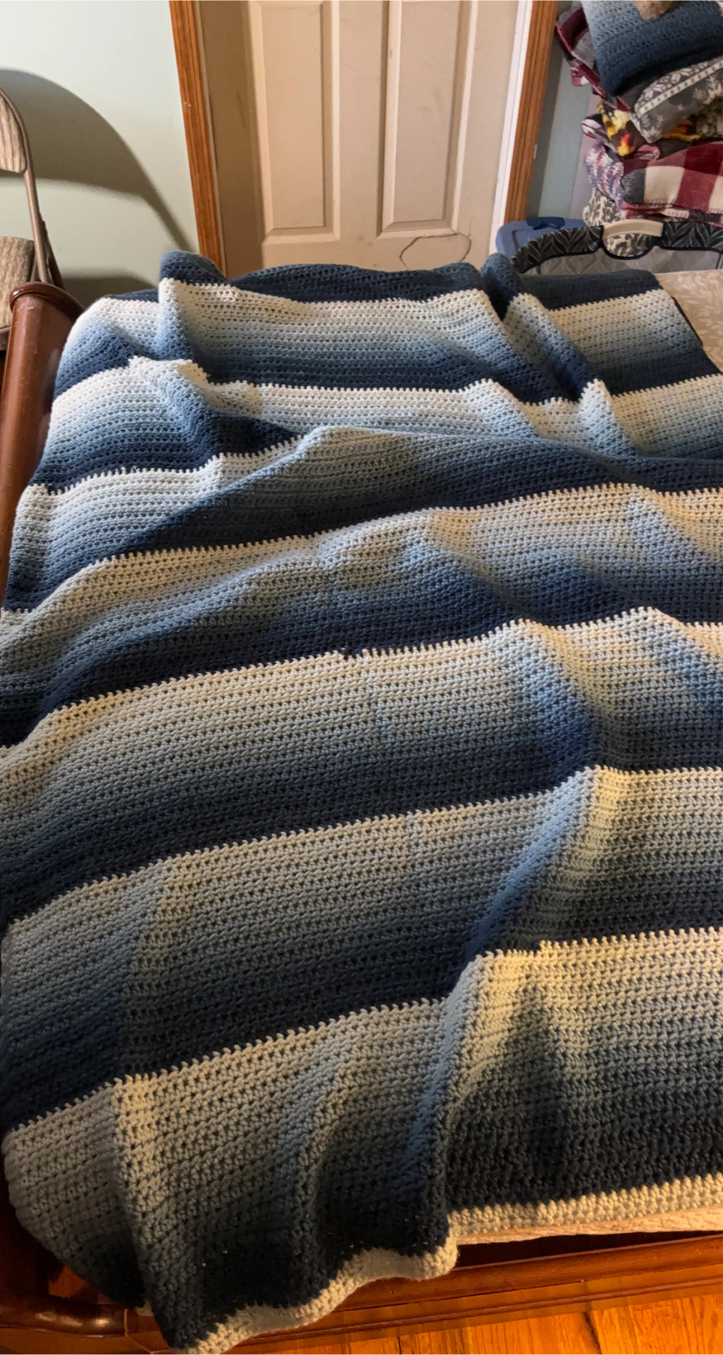 Selling a lovely handmade crochet blanket. It features a beautiful blue ombre color scheme. The blanket is soft and cozy, perfect for adding a touch of warmth and style to any room