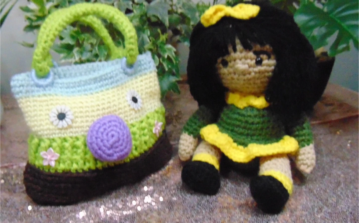 Adorable handmade crochet doll and matching bag! The doll is dressed in a cute green and yellow outfit, and the bag features a colorful design with floral accents. Perfect for adding a touch of handmade charm to your little one's playtime