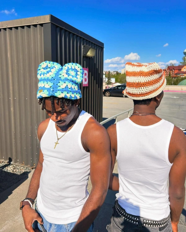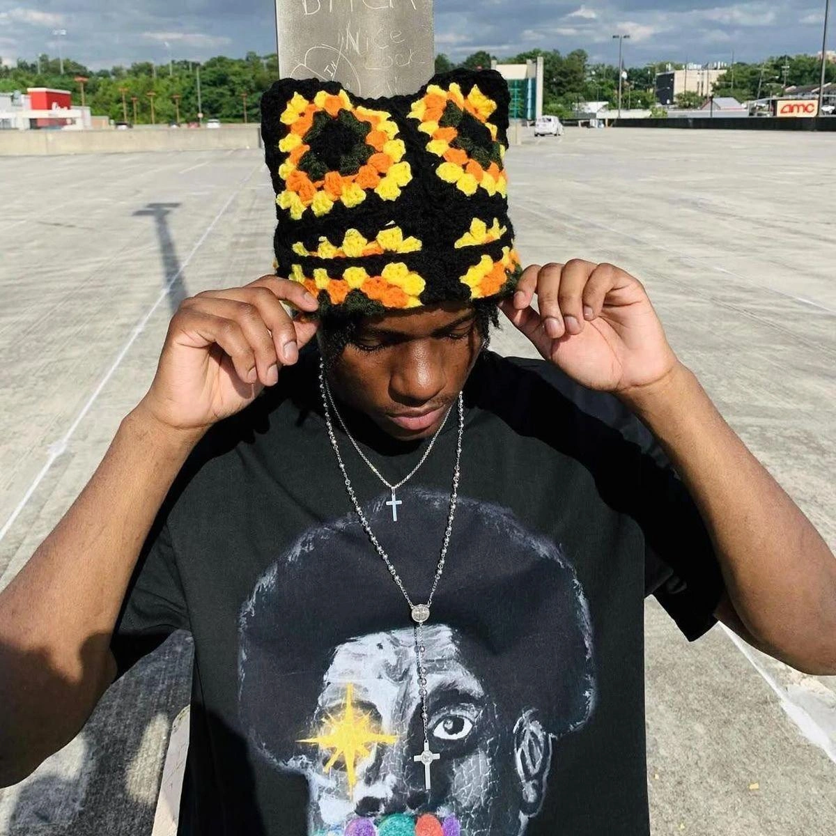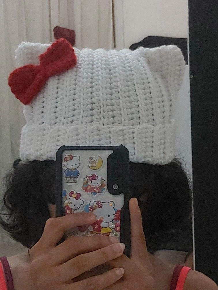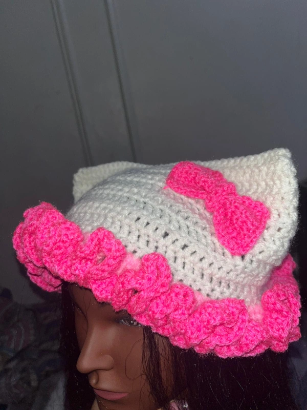 I'm selling a handmade crochet hat and a set of crochet scrunchies. The hat is white with pink accents, and the scrunchies come in various colors. They're all in great condition and ready for a new home!